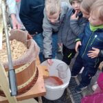 Zunächst bekamen die interessierten Kinder eine kleine theoretische Einführung im Fach Obstanbau. Sofort meldeten sich einige tatkräftige Helfer für die Ernte im kommenden Jahr. Anschließend beobachteten die Kinder, wie die Äpfel gewaschen, gehäckselt und in die Apfelpresse eingefüllt werden. Beim Pressen der Äpfel waren selbstverständlich alle starken Eisbären mit ganzer Muskelkraft dabei. Es wurde abwechselnd gekurbelt, gepumpt und wieder gekurbelt. Alle wurden mit einem energischen Hau-Ruck angefeuert. Voller Vorfreude auf den süßen Saft wurden schon die Tropfen auf dem Weg in dem Eimer von den Leckermäulchen aufgefangen. Dann war es soweit, der leckere Saft wurde in die Becher gefüllt und durfte probiert werden. Alle waren total begeistert und wollten mehr von dem leckeren Geschenk der Natur. Zum Apfelsaft gab es nach getaner Arbeit Brezeln. Gesättigt und zufrieden durften sich die Erstklässler noch auf dem Schulhof austoben. Fazit der Kinder: Das können wir jede Woche machen.