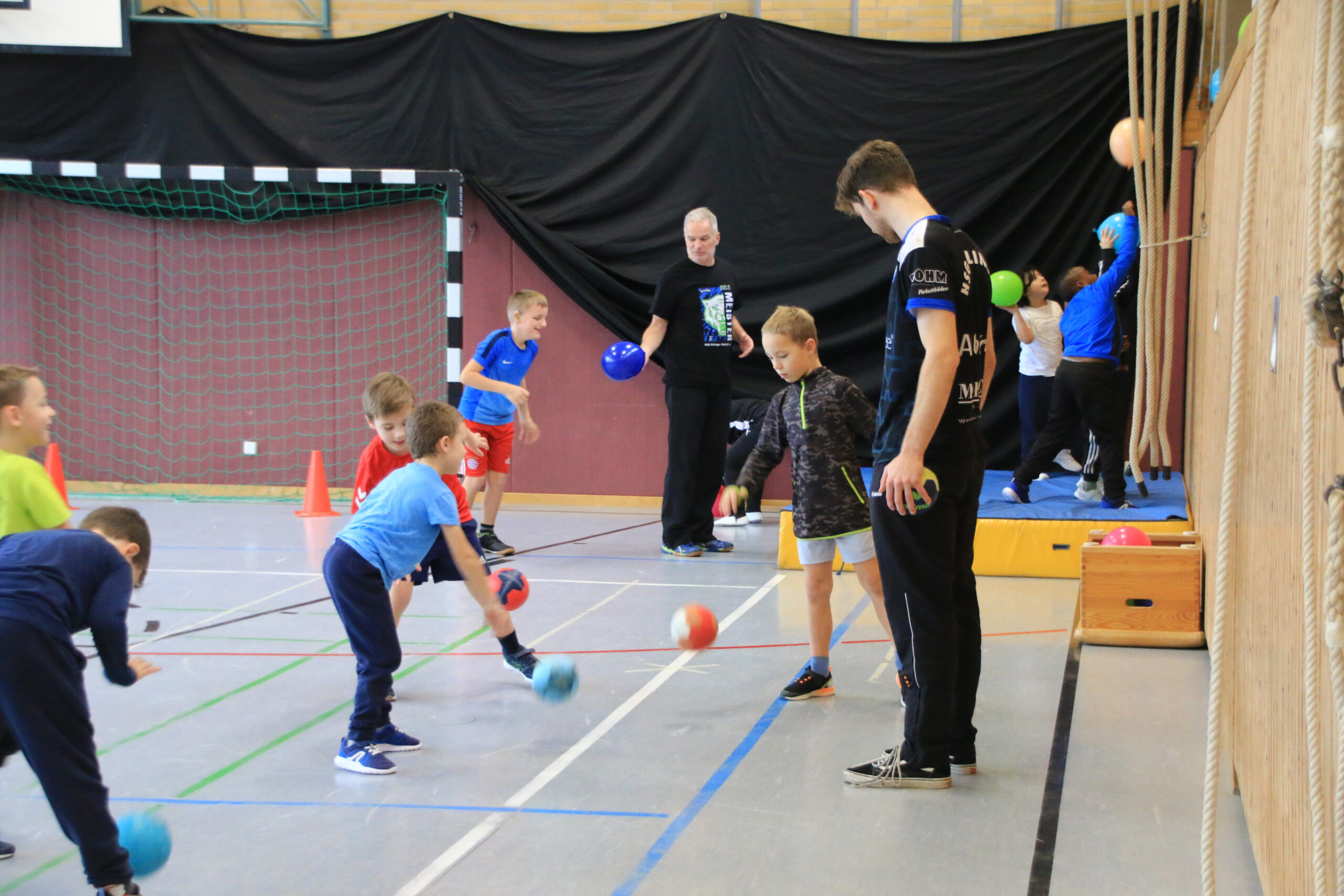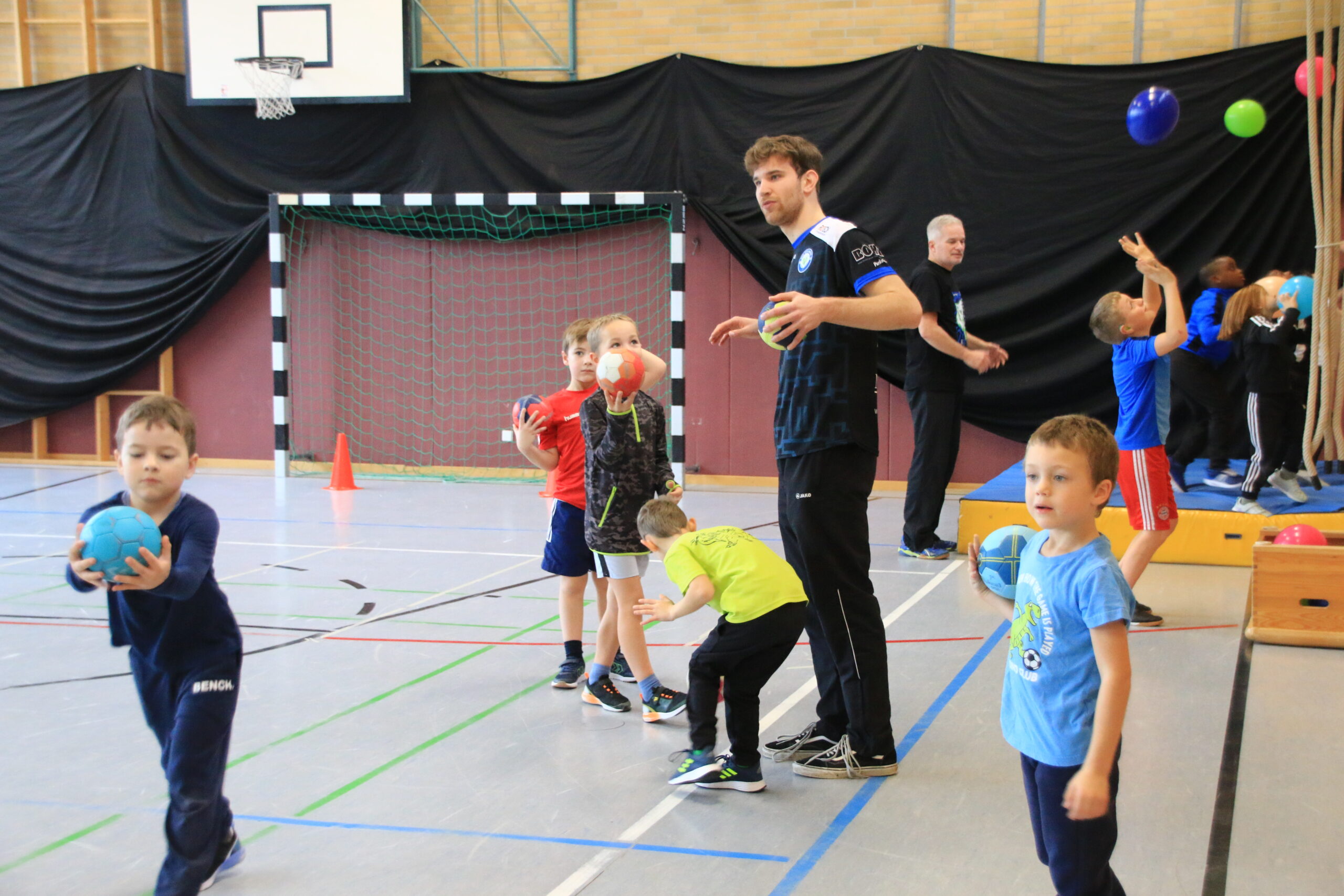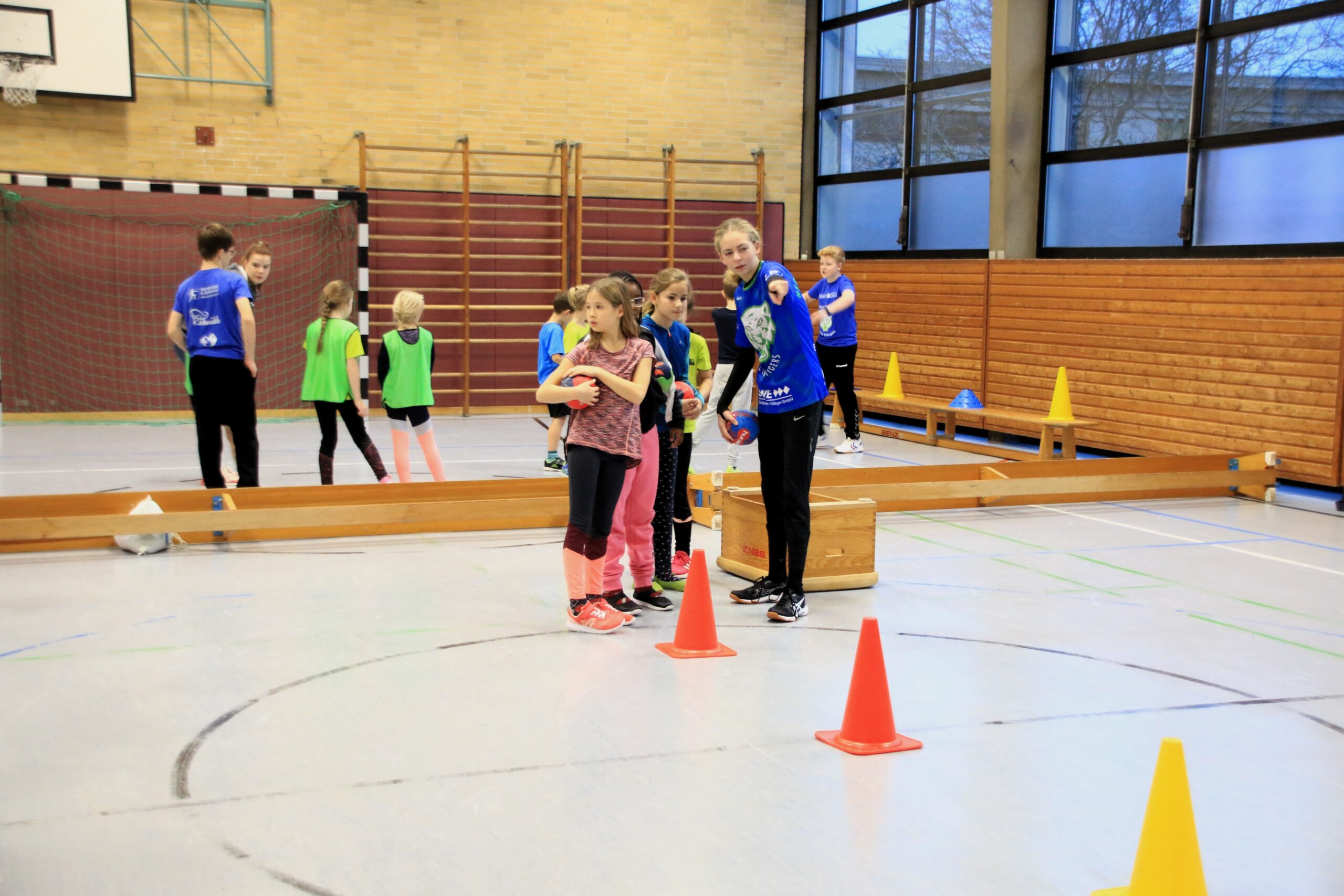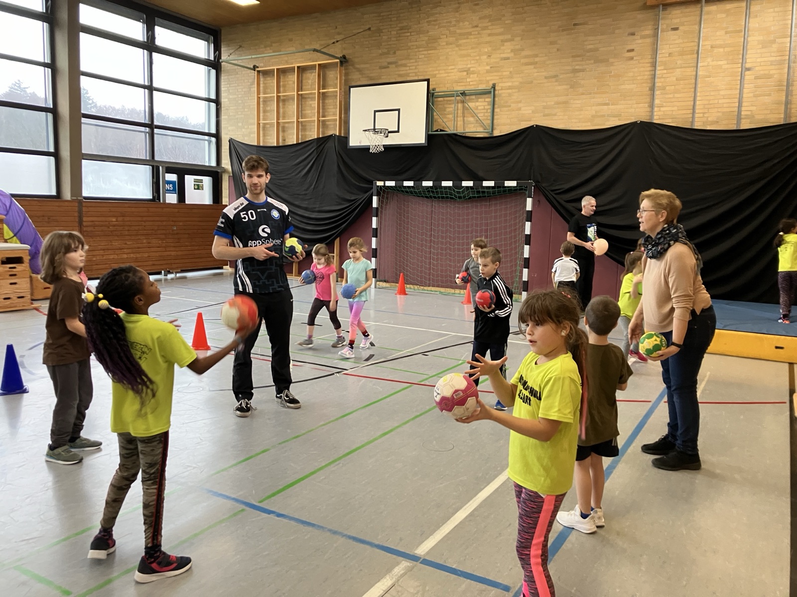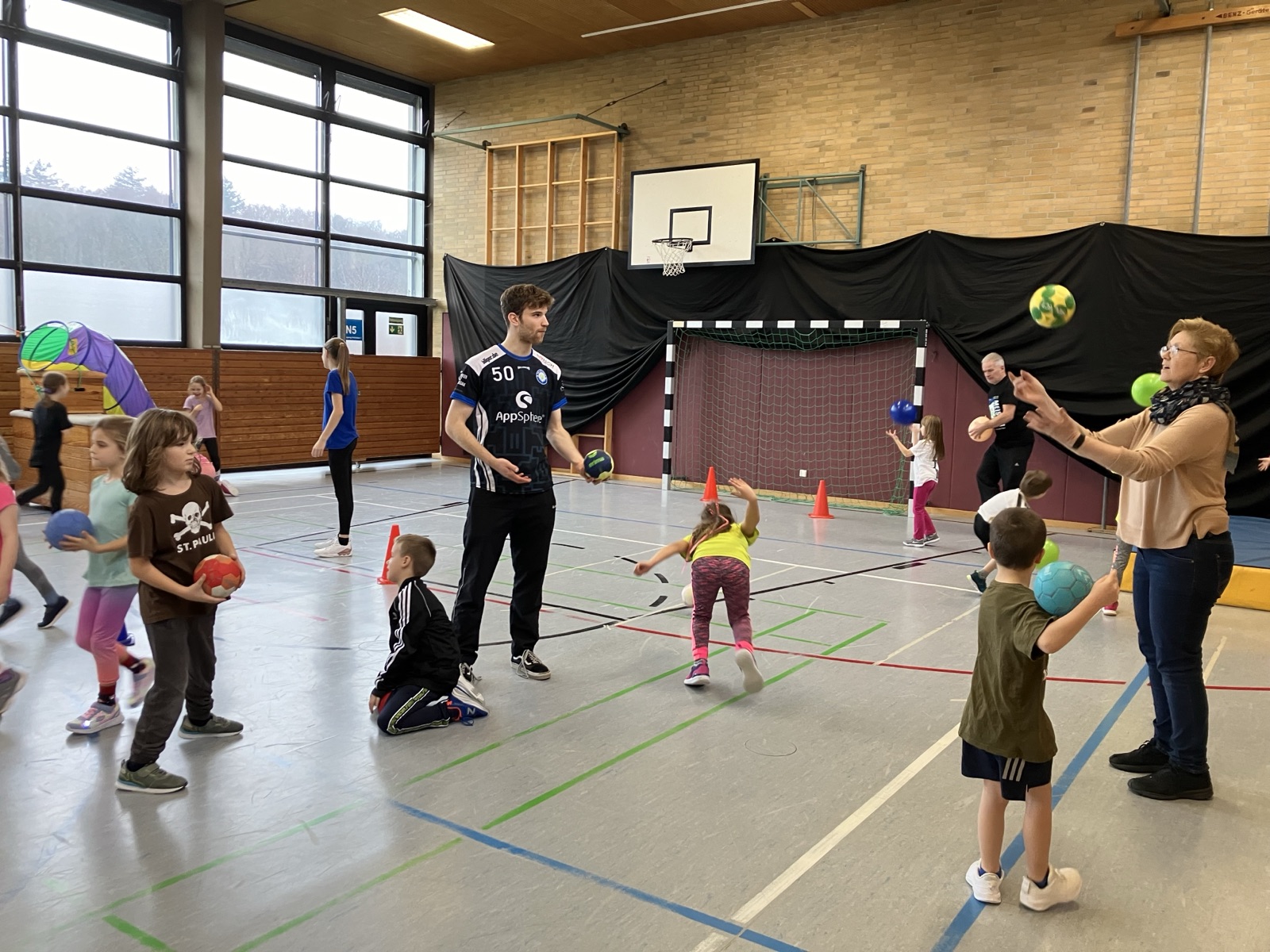 10 Spieler und Spielerinnen der HSG Bruchhausen waren gekommen, um die Grundschüler für die Sportart Handball zu begeistern. Unter der organisatorischen Leitung von Sandra Huth hatten sie verschiedene Stationen aufgebaut, an denen sich die Kinder  ausprobieren durften.