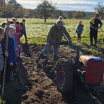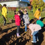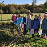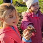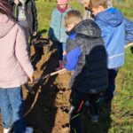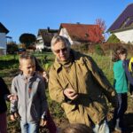 Das absolute Highlight war jedoch mit Sicherheit die Kartoffelernte am 23. Oktober. Frau Anderer vom Obst- und Gartenbauverein holte uns morgens bei strahlendem Sonnenschein an der Schule ab und führte uns zum Kartoffelacker, wo uns Herr und Frau Weber freudig erwarteten und den Acker bereits aufgelockert hatten. So konnten die Kinder direkt mit der Ernte, der von ihnen im April gesetzten Kartoffeln beginnen. Da es tagelang immer wieder viel geregnet hatte, war es eine recht matschige Angelegenheit und neben den Kartoffeln wurden zur Freude einiger Kinder auch viele Regenwürmer gefunden. Insgesamt ernteten wir rund 260 Kartoffeln. Die größte und schwerste wog sagenhafte 490Gramm. Jedes Kind durfte direkt 10 Kartoffeln mit nachhause nehmen.