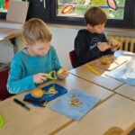 Die restlichen Kartoffeln brachte uns Herr Weber am darauffolgenden Tag in die Schule, sodass wir sie am Freitag mit Hilfe von zwei lieben Mamis zu leckeren Ofenkartoffeln bzw. Kartoffelspalten verarbeiten konnten. Alle Kinder schälten und schnippelten mit großer Freude Kartoffeln, Karotten und Gurken. Zusätzlich wurde zweierlei Quarks angerührt und die Wartezeit mit Schätzaufgaben und einem Kartoffelquiz überbrückt. Es schmeckte hervorragend und alle konnten schließlich gestärkt und glücklich in die Herbstferien starten.