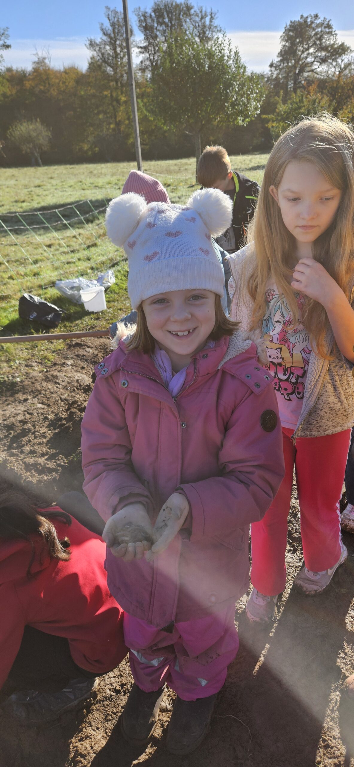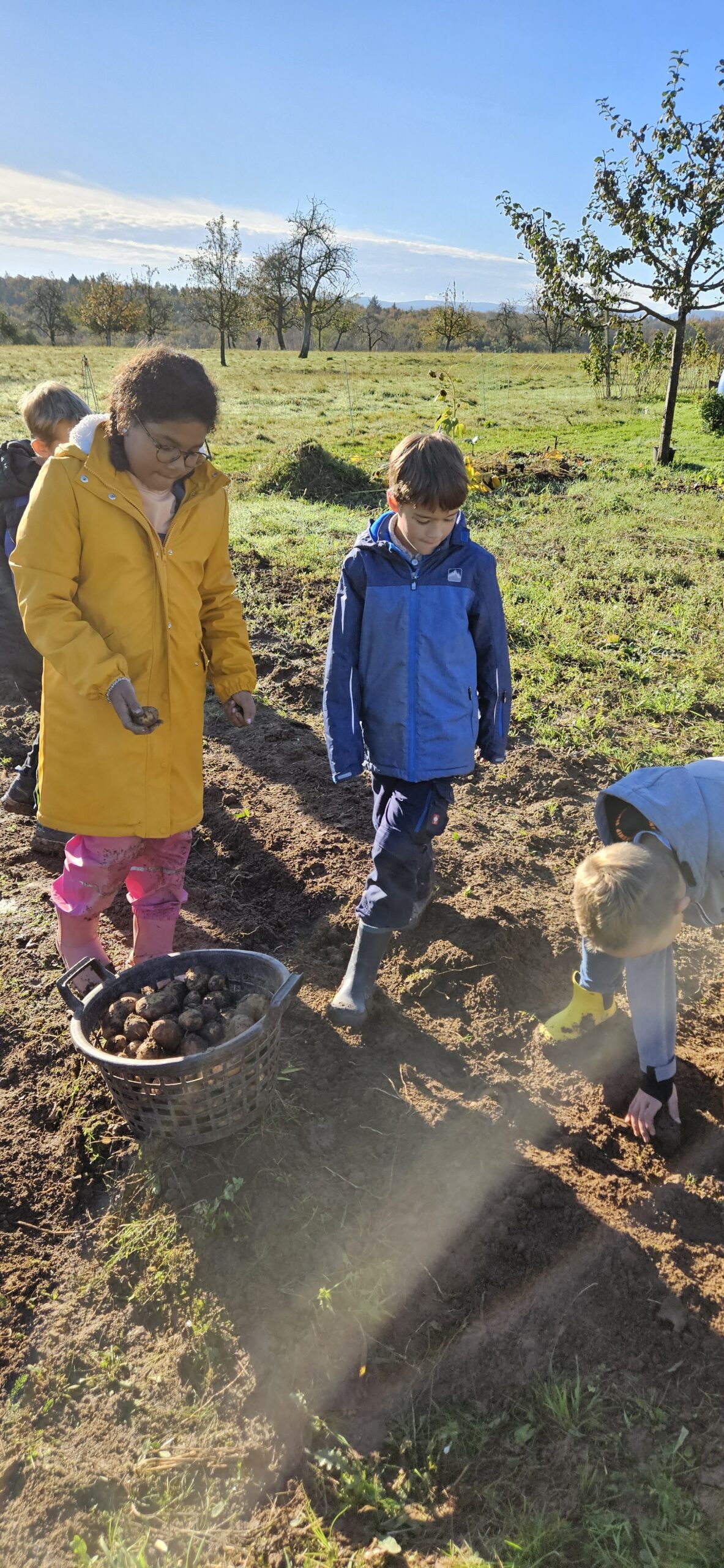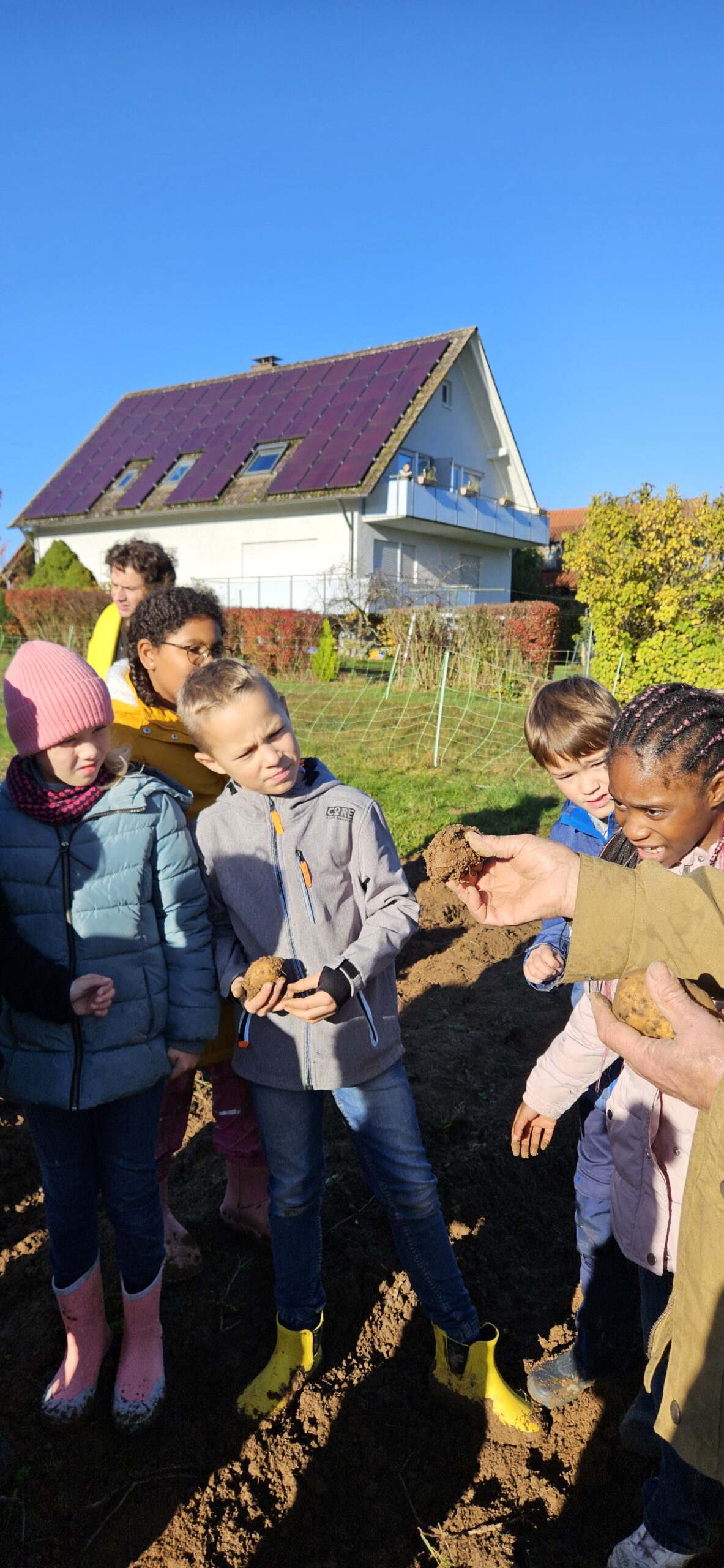 Das absolute Highlight war jedoch mit Sicherheit die Kartoffelernte am 23. Oktober. Frau Anderer vom Obst- und Gartenbauverein holte uns morgens bei strahlendem Sonnenschein an der Schule ab und führte uns zum Kartoffelacker, wo uns Herr und Frau Weber freudig erwarteten und den Acker bereits aufgelockert hatten. So konnten die Kinder direkt mit der Ernte, der von ihnen im April gesetzten Kartoffeln beginnen. Da es tagelang immer wieder viel geregnet hatte, war es eine recht matschige Angelegenheit und neben den Kartoffeln wurden zur Freude einiger Kinder auch viele Regenwürmer gefunden. Insgesamt ernteten wir rund 260 Kartoffeln. Die größte und schwerste wog sagenhafte 490Gramm. Jedes Kind durfte direkt 10 Kartoffeln mit nachhause nehmen.