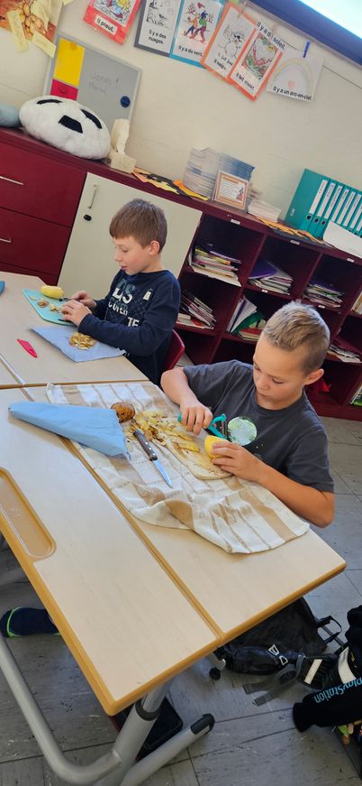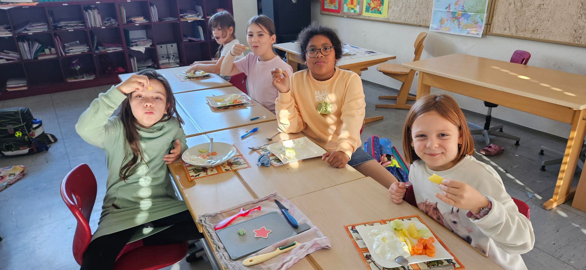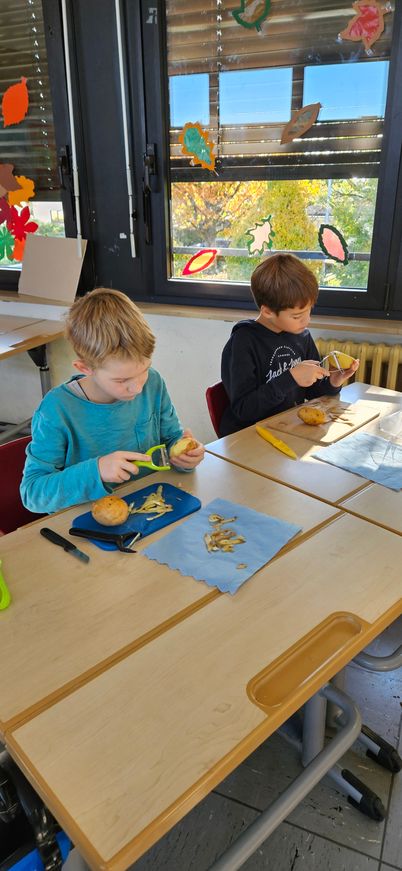Die restlichen Kartoffeln brachte uns Herr Weber am darauffolgenden Tag in die Schule, sodass wir sie am Freitag mit Hilfe von zwei lieben Mamis zu leckeren Ofenkartoffeln bzw. Kartoffelspalten verarbeiten konnten. Alle Kinder schälten und schnippelten mit großer Freude Kartoffeln, Karotten und Gurken. Zusätzlich wurde zweierlei Quarks angerührt und die Wartezeit mit Schätzaufgaben und einem Kartoffelquiz überbrückt. Es schmeckte hervorragend und alle konnten schließlich gestärkt und glücklich in die Herbstferien starten.