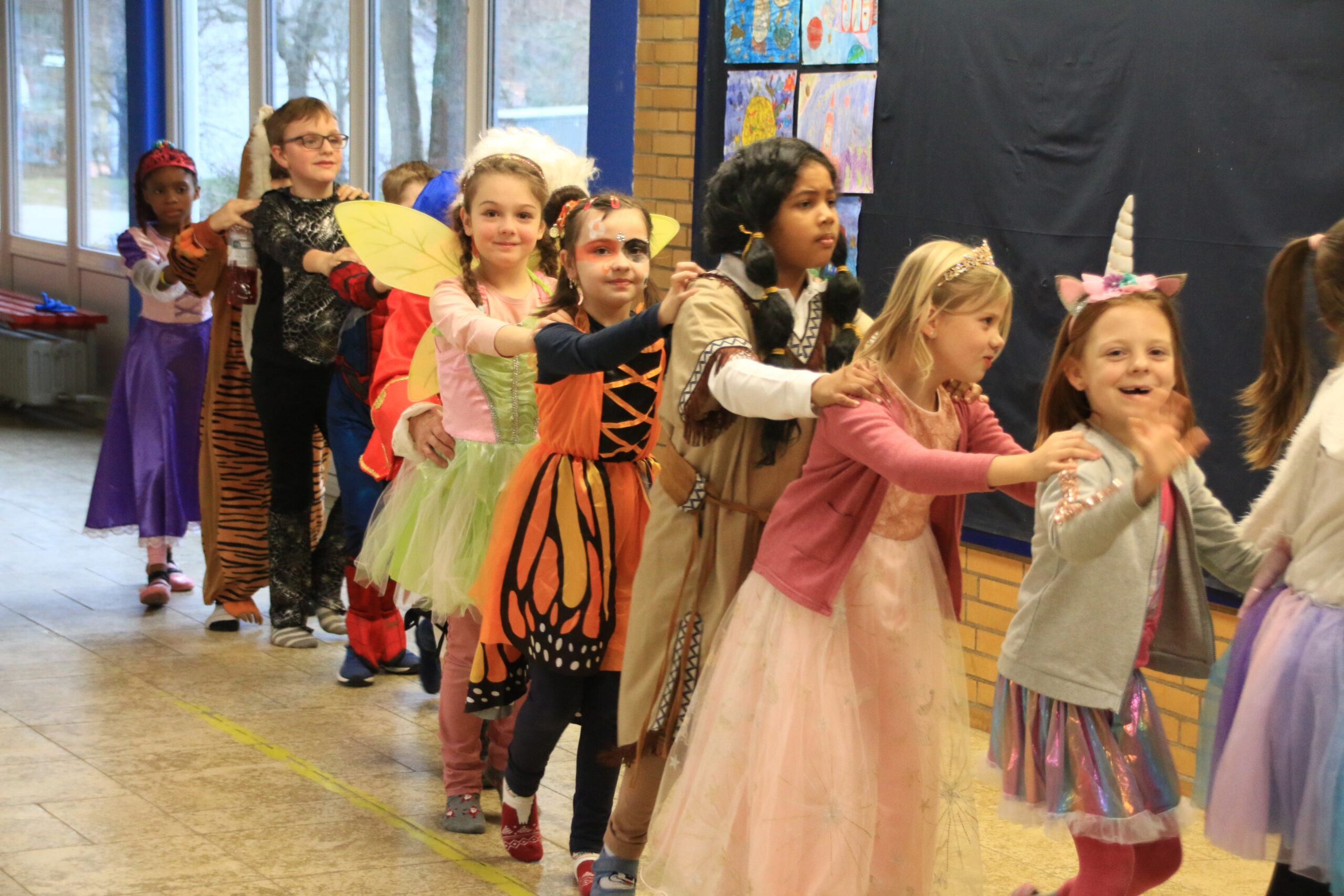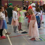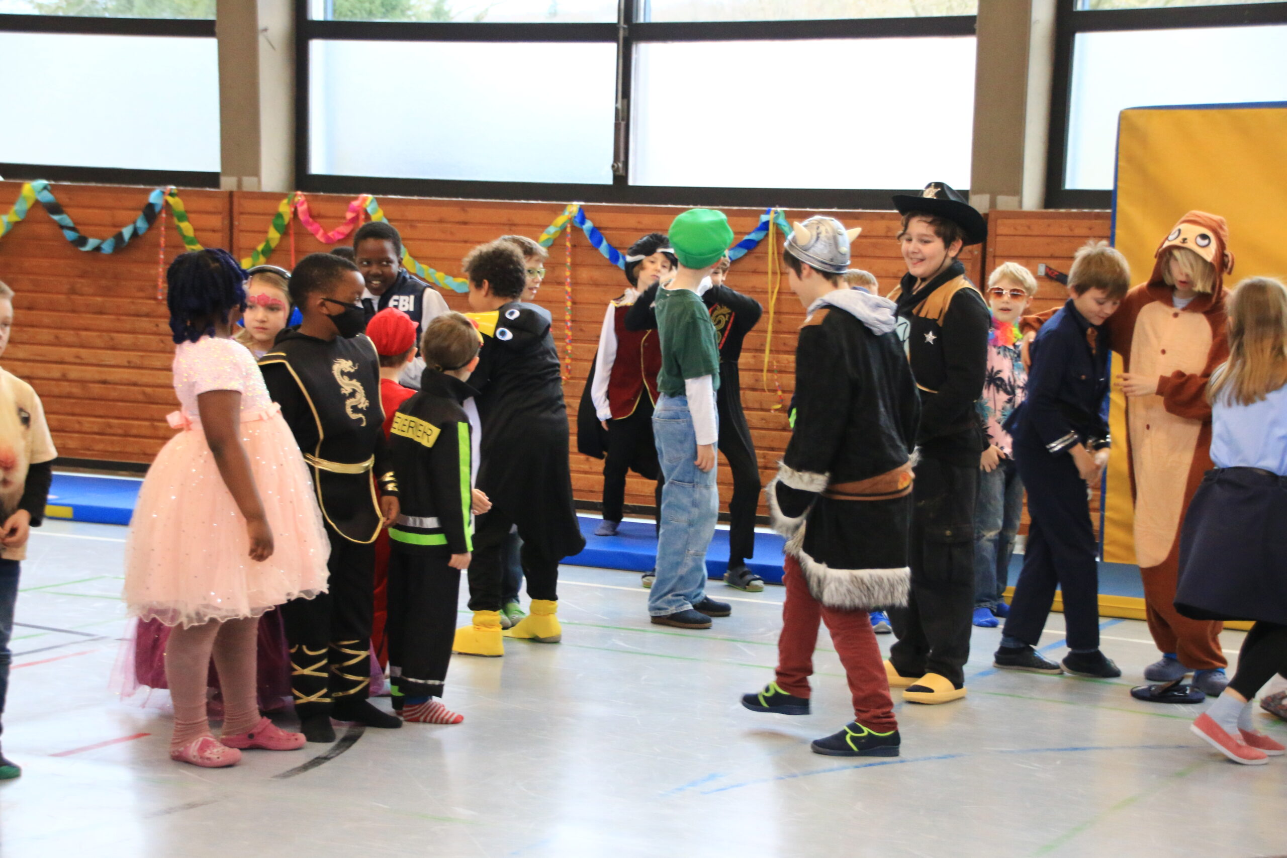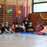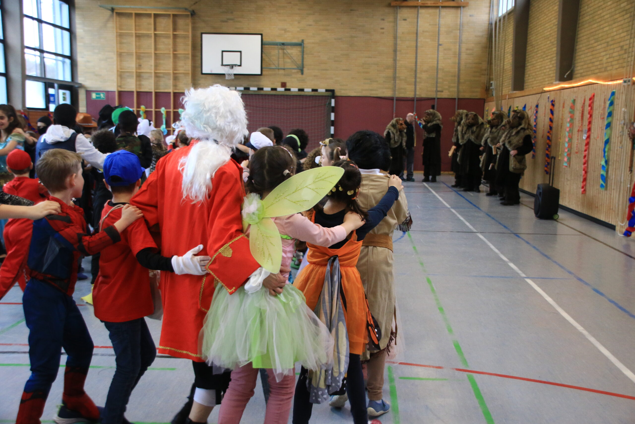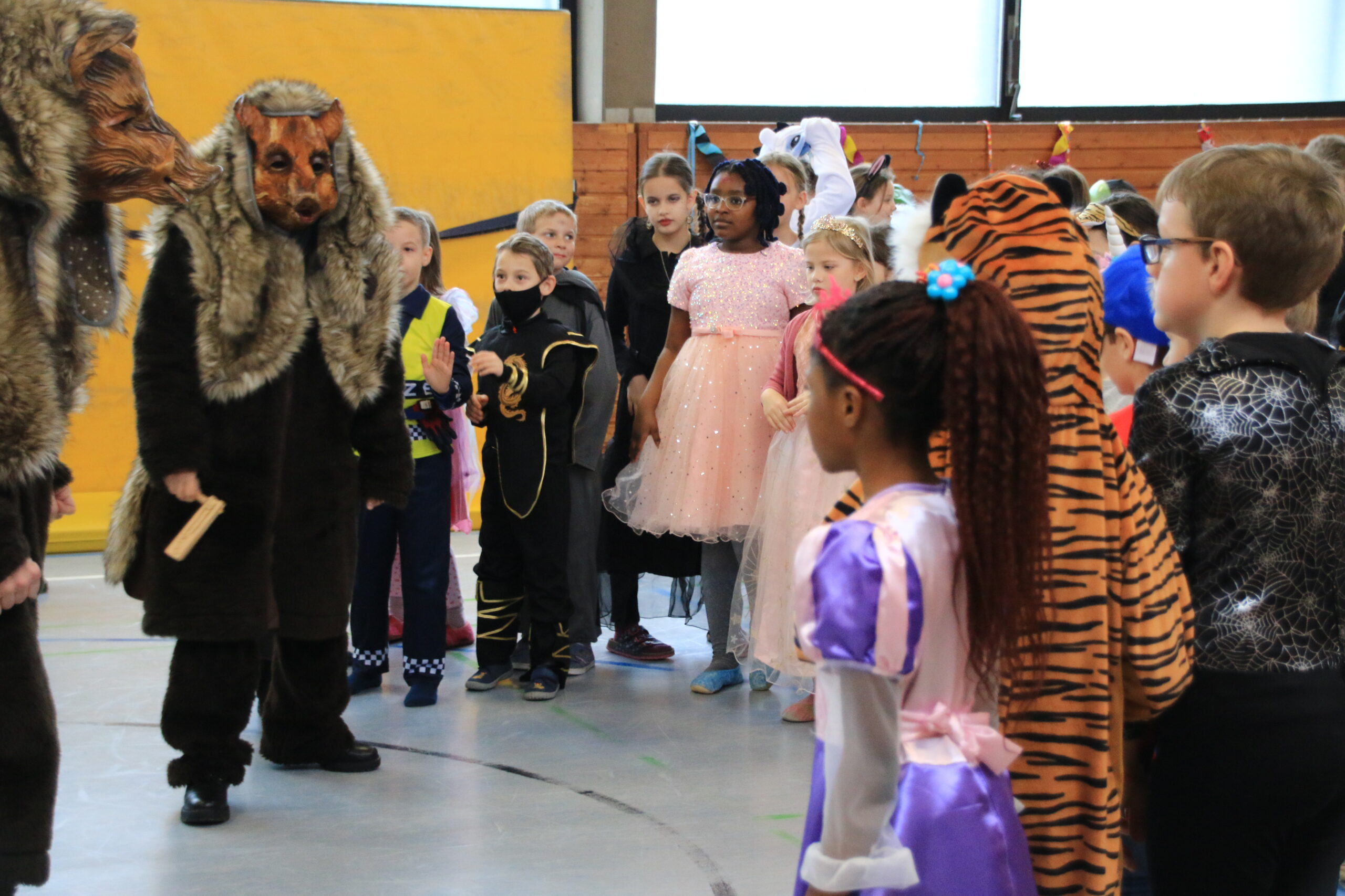 Bald wurden alle Klassen mit Musik in einer lautstarken Polonaise von Maskenträgern der Spessarter Eber (Leitung:  Sophia Keller) in die Turnhalle abgeholt. Diese war bereits am Vortag vom Team der Nachmittagsbetreuung und den Kindern bunt geschmückt worden. Fleißig hatten die Schüler dafür in der Nachmittagsbetreung der Schule bunte Girlanden gebastelt.