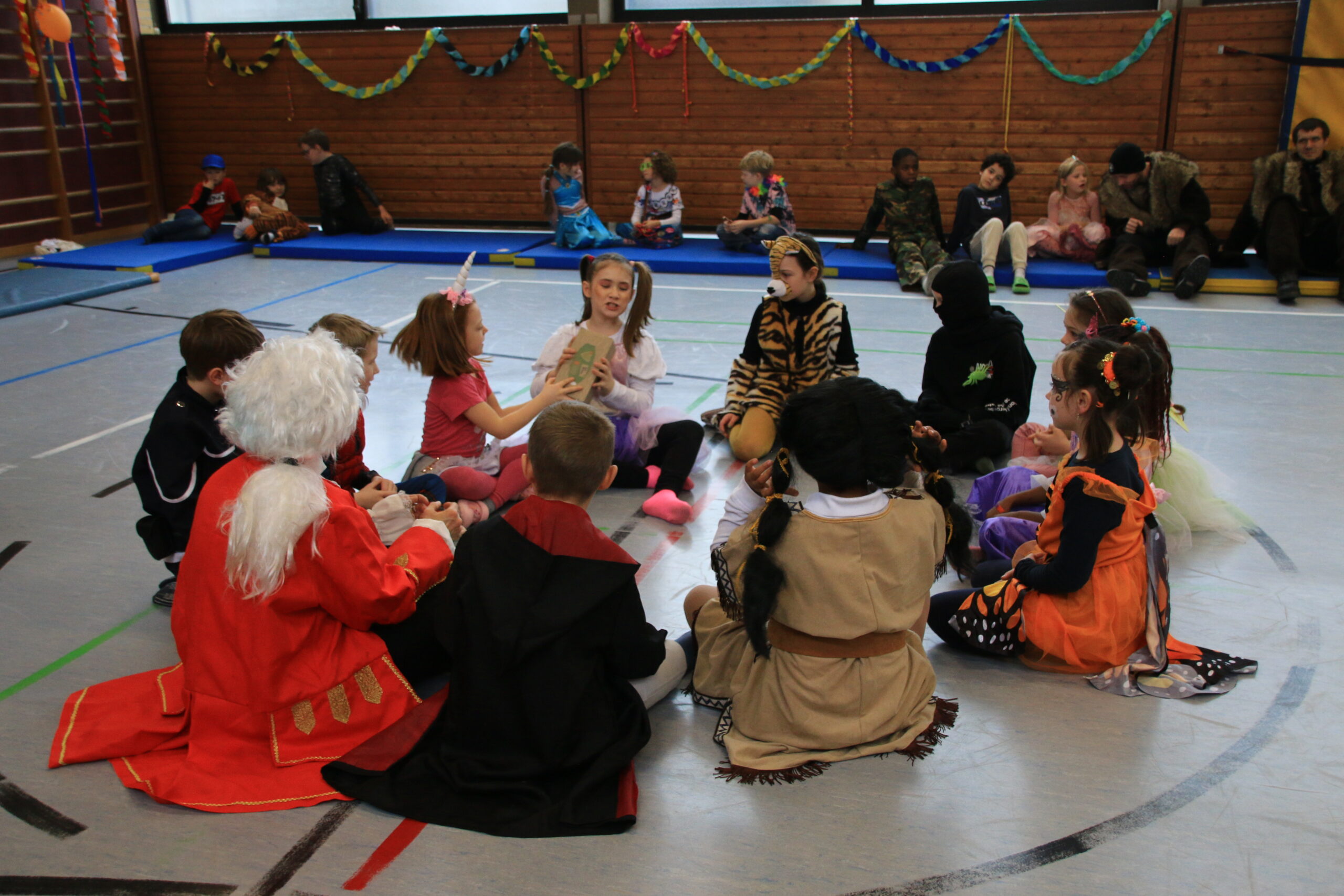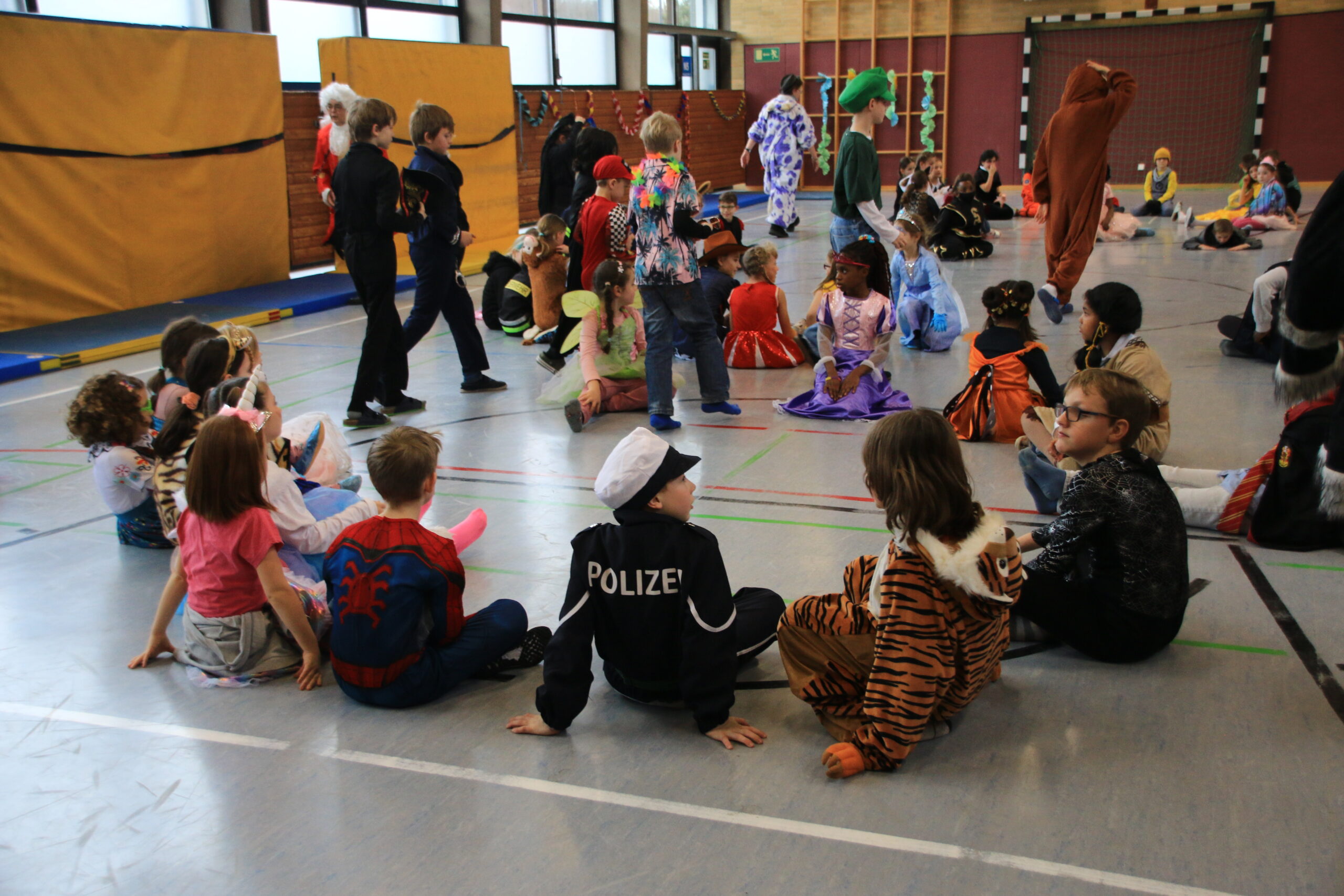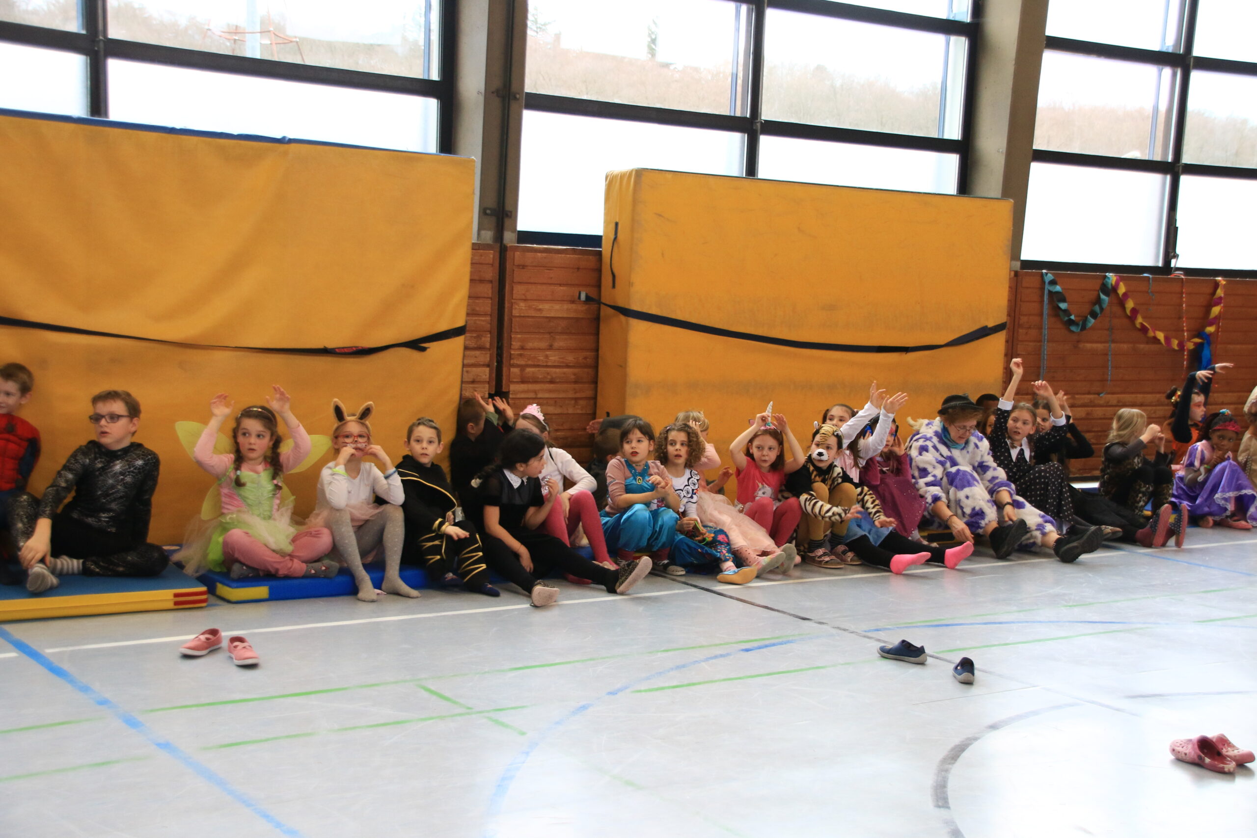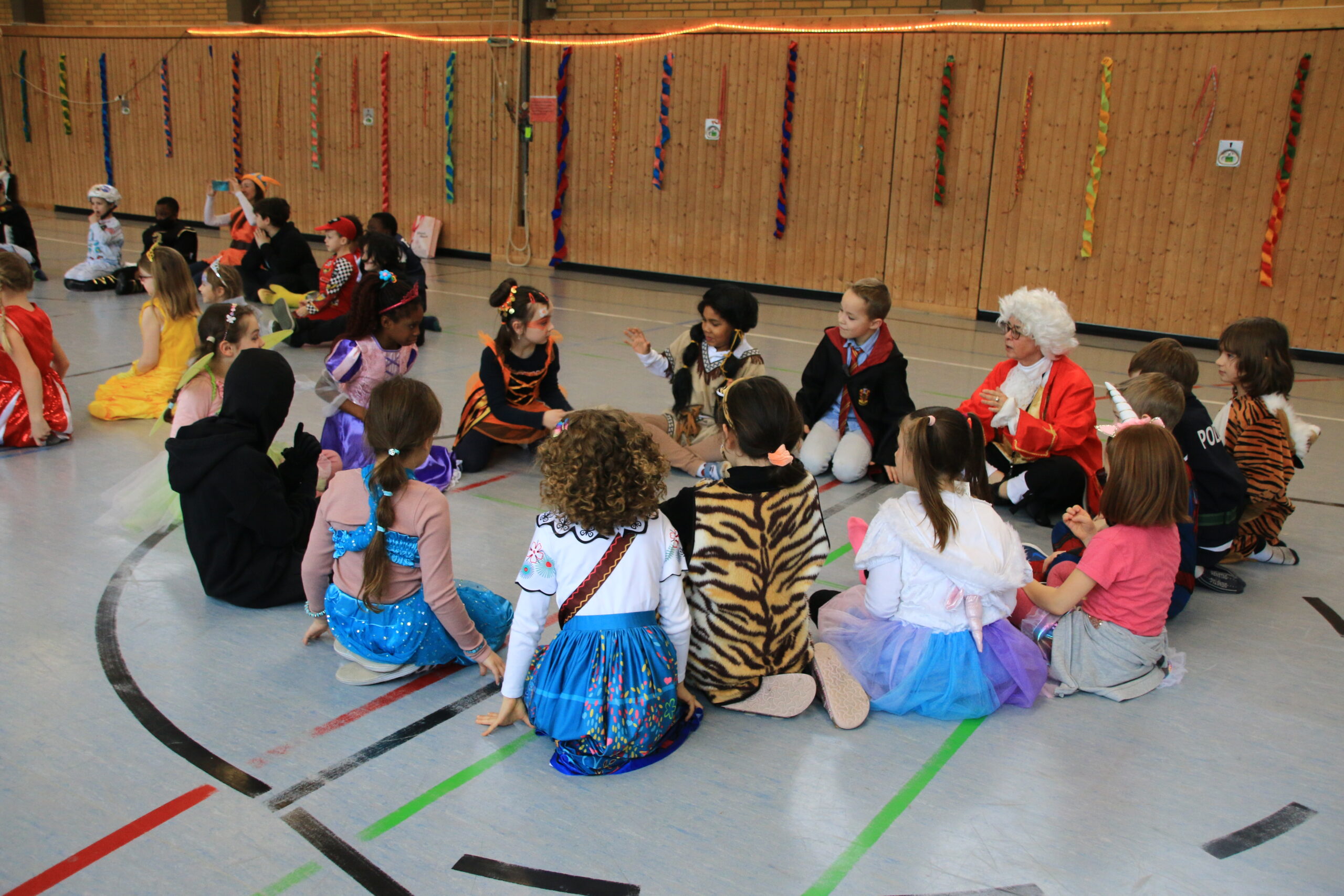 Bald wurden alle Klassen mit Musik in einer lautstarken Polonaise von Maskenträgern der Spessarter Eber (Leitung:  Sophia Keller) in die Turnhalle abgeholt. Diese war bereits am Vortag vom Team der Nachmittagsbetreuung und den Kindern bunt geschmückt worden. Fleißig hatten die Schüler dafür in der Nachmittagsbetreung der Schule bunte Girlanden gebastelt.