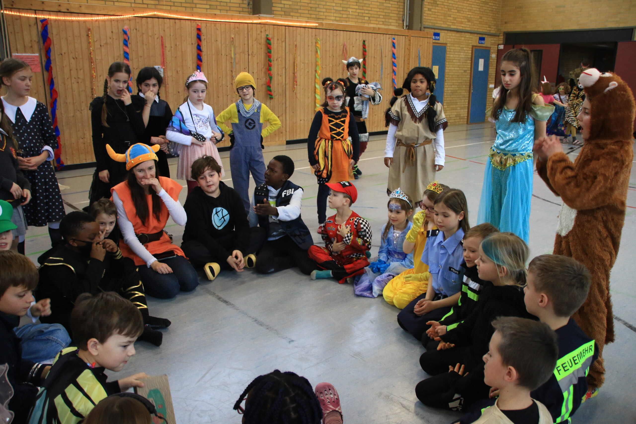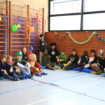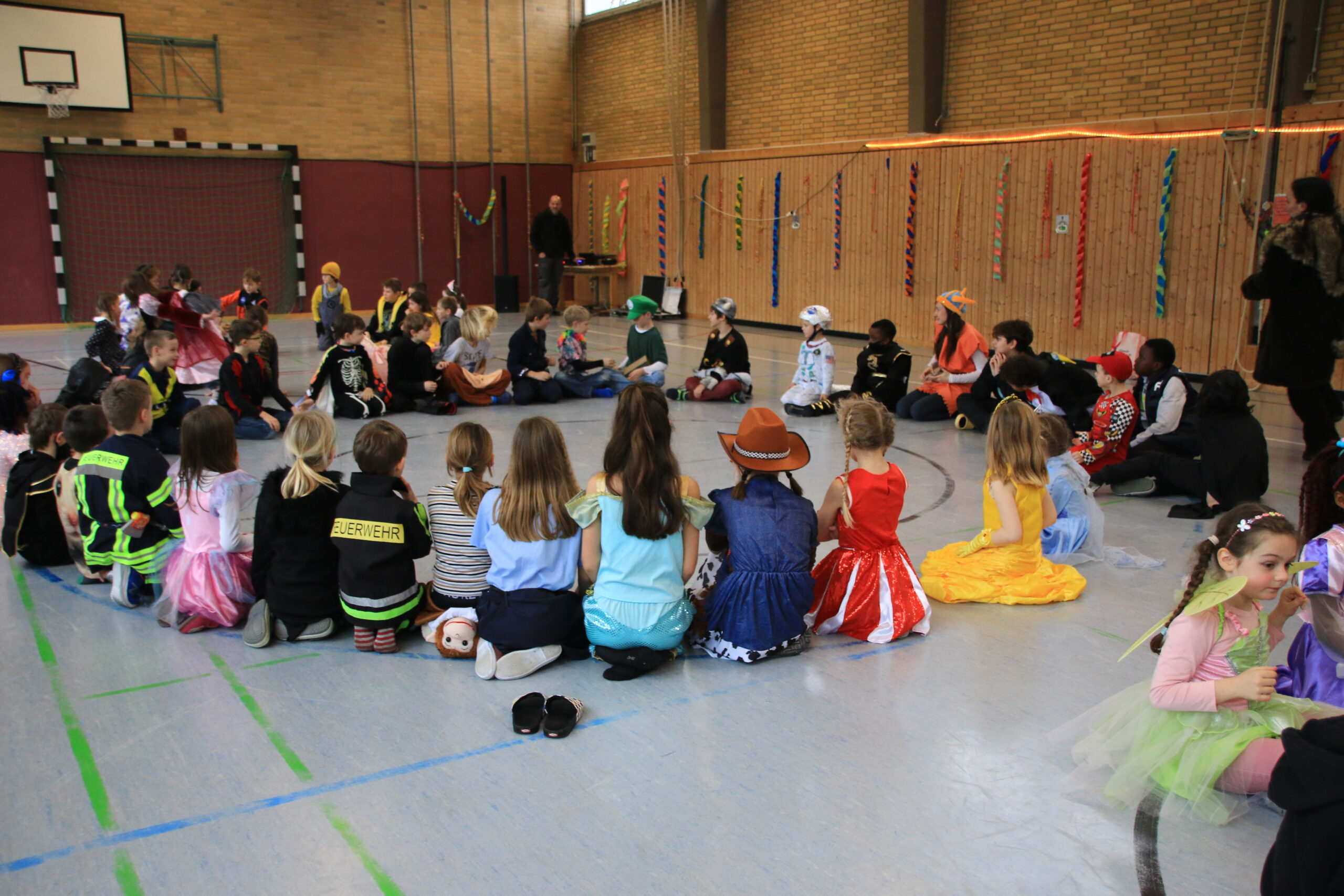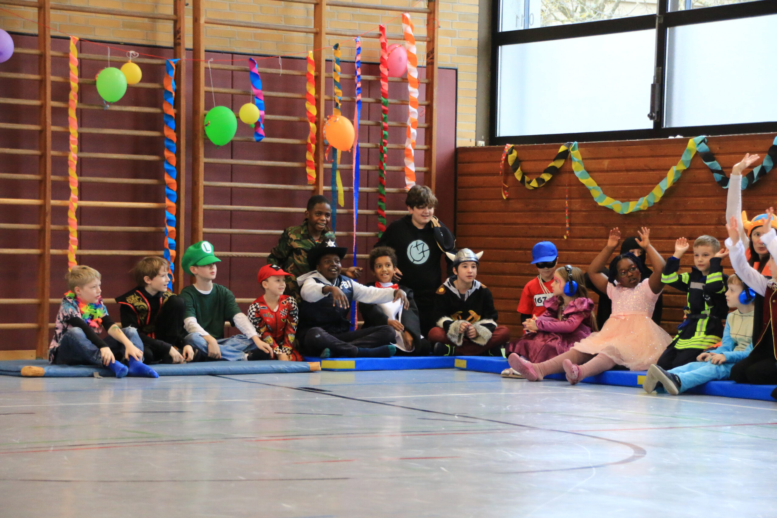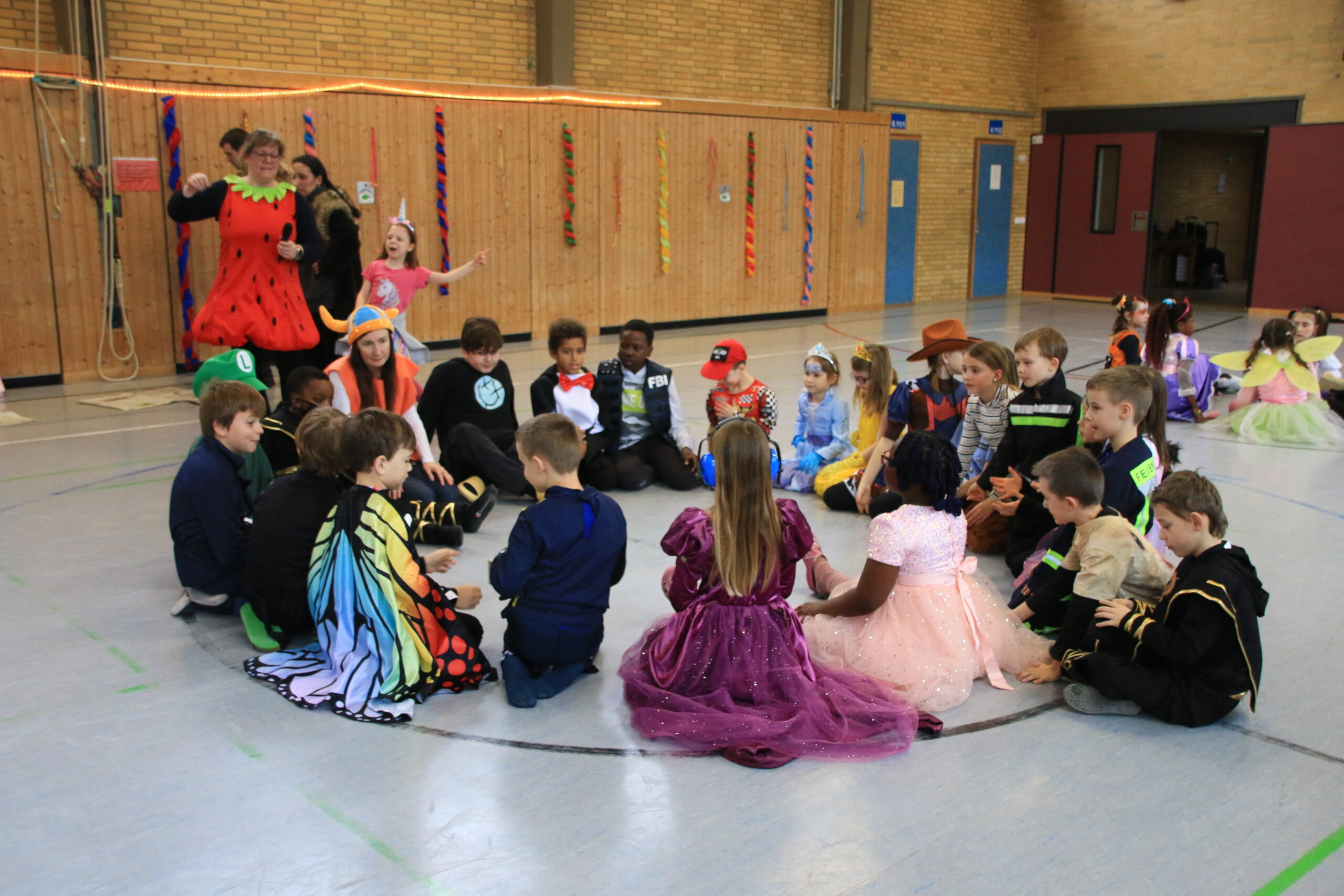Bald wurden alle Klassen mit Musik in einer lautstarken Polonaise von Maskenträgern der Spessarter Eber (Leitung:  Sophia Keller) in die Turnhalle abgeholt. Diese war bereits am Vortag vom Team der Nachmittagsbetreuung und den Kindern bunt geschmückt worden. Fleißig hatten die Schüler dafür in der Nachmittagsbetreung der Schule bunte Girlanden gebastelt.