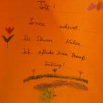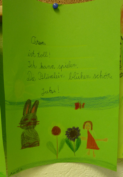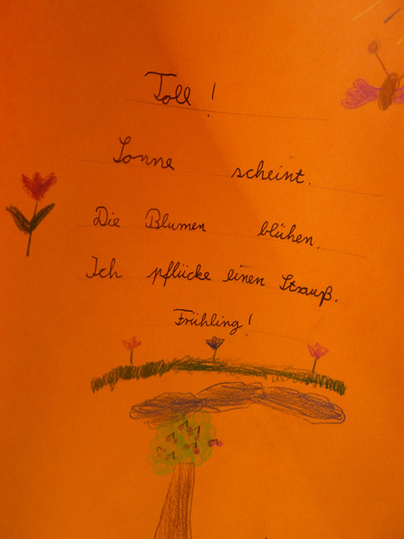 Die zweite Klasse hat sich im letzten Monat ganzheitlich intensiv mit dem Frühling beschäftigt. Die Kinder ließen sich von Künstlern und ihren Werken bei Bildbetrachtungen begeistern und malten im Anschluss ein bekanntes Frühlingsbild von Monet nach. Die kleine Raupe Nimmersatt wurde im Französischunterricht in französischer Sprache auswendig gelernt, und wie „so nebenbei“ lernten die Kinder Nahrungsmittel, Wochentage und andere Worte in französischer Sprache zu benennen. Eine kleine Theateraufführung war der Höhepunkt. Im naturwissenschaftlichen Unterricht lernten die Kinder daraufhin die Entwicklung einer Raupe zum Schmetterling kennen, und das Anmalen von verschiedenen Schmetterlingen in ihren schillernden Farben erfüllte sie mit Freude. „Tiere im Frühling“ war ein sehr beliebtes Thema, und vor allen Dingen waren die Kinder sehr an den Vögeln und ihren Stimmen interessiert. So manch einer kann bereits verschiedene Vogelstimmen unterscheiden. Das Leben, das Brüten und die Aufzucht der jungen Amseln ließ die Kinder ebenfalls in Staunen versetzen. So wurde auch ein Nest aus Gräsern gebastelt und aus Tonpapier die Vogelkinder und Vogeleltern ergänzt, nachdem ein echtes Nest genau betrachtet und angeschaut worden war. Ein selbstgeschriebenes Frühlingselfchen war nicht immer leicht zu formulieren gewesen – aber auch diese Aufgabe wurde hervorragend gelöst. Da war es fast einfach, das Gedicht von J. Ringelnatz „Das Samenkorn“ auswendig zu lernen.