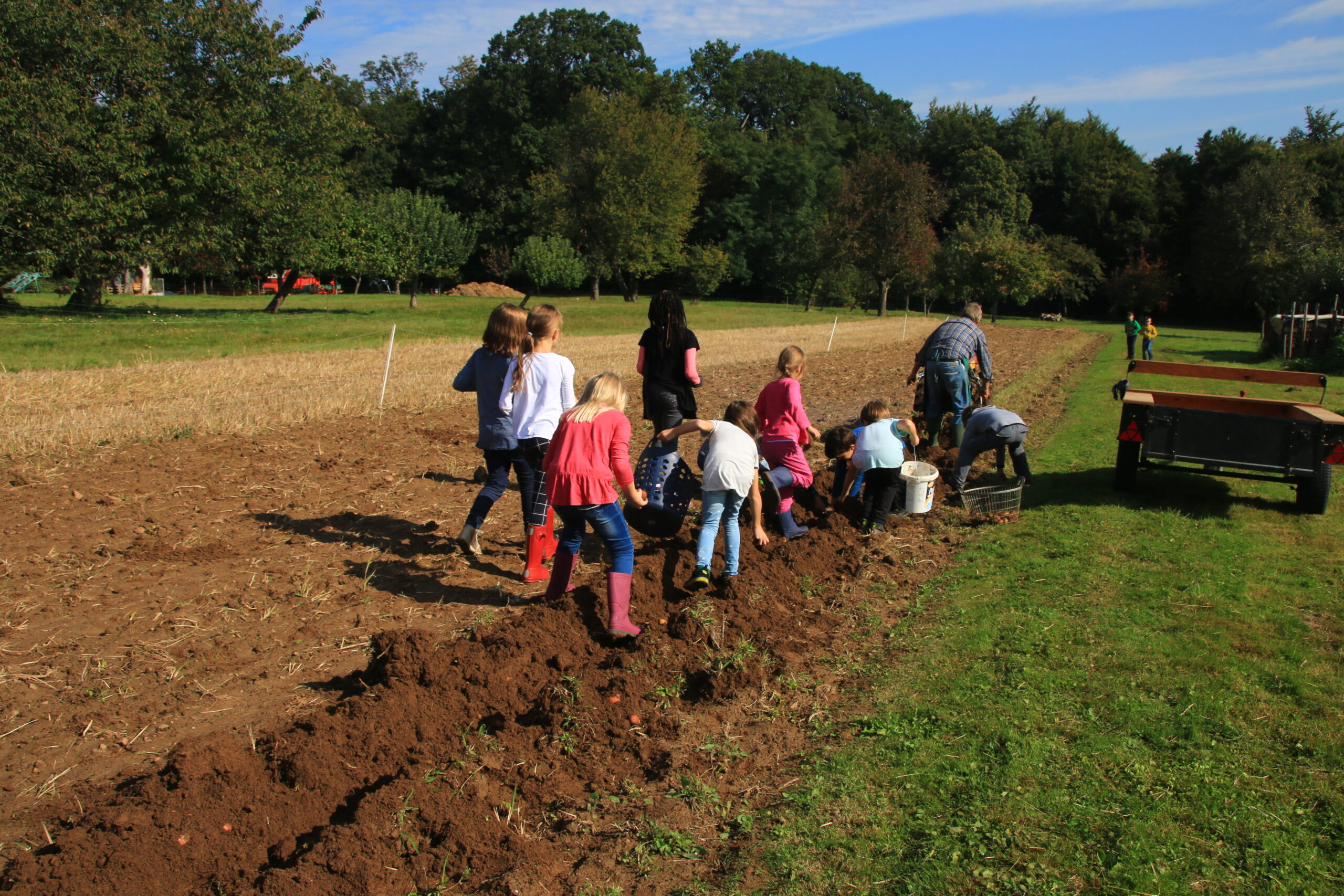 Diese spannenden Fragen stellen sich die Drittklässler zur Zeit zum Thema Kartoffel im Sachunterricht. Doch zunächst einmal ging es zur Ernte von Kartoffeln auf den Acker. Herr und Frau Weber vom Obst- und Gartenbauverein Spessart hatten eingeladen, auf ihrem Kartoffelfeld zu ernten. Nachdem Herr Weber eine Furche aufgeworfen hatte, konnten die Kartoffeln aufgelesen werden. Mit vollem Einsatz und großer Begeisterung stellten sich die Kinder dieser Aufgabe. Dabei musste zum Teil noch ganz ordentlich gebuddelt werden, um die Knollen auch wirklich alle zu finden. Schnell waren die zahlreichen Säcke und Eimer gefüllt und ihr Inhalt auf den Anhänger geschüttet. Zum Abschluss durfte sich jedes Kind noch ein Säckchen Kartoffeln mitnehmen und Herr Weber versprach, noch einen Eimer Kartoffeln zu spendieren, wenn es im Sachunterricht dann an das Ausprobieren von Kartoffelrezepten geht.