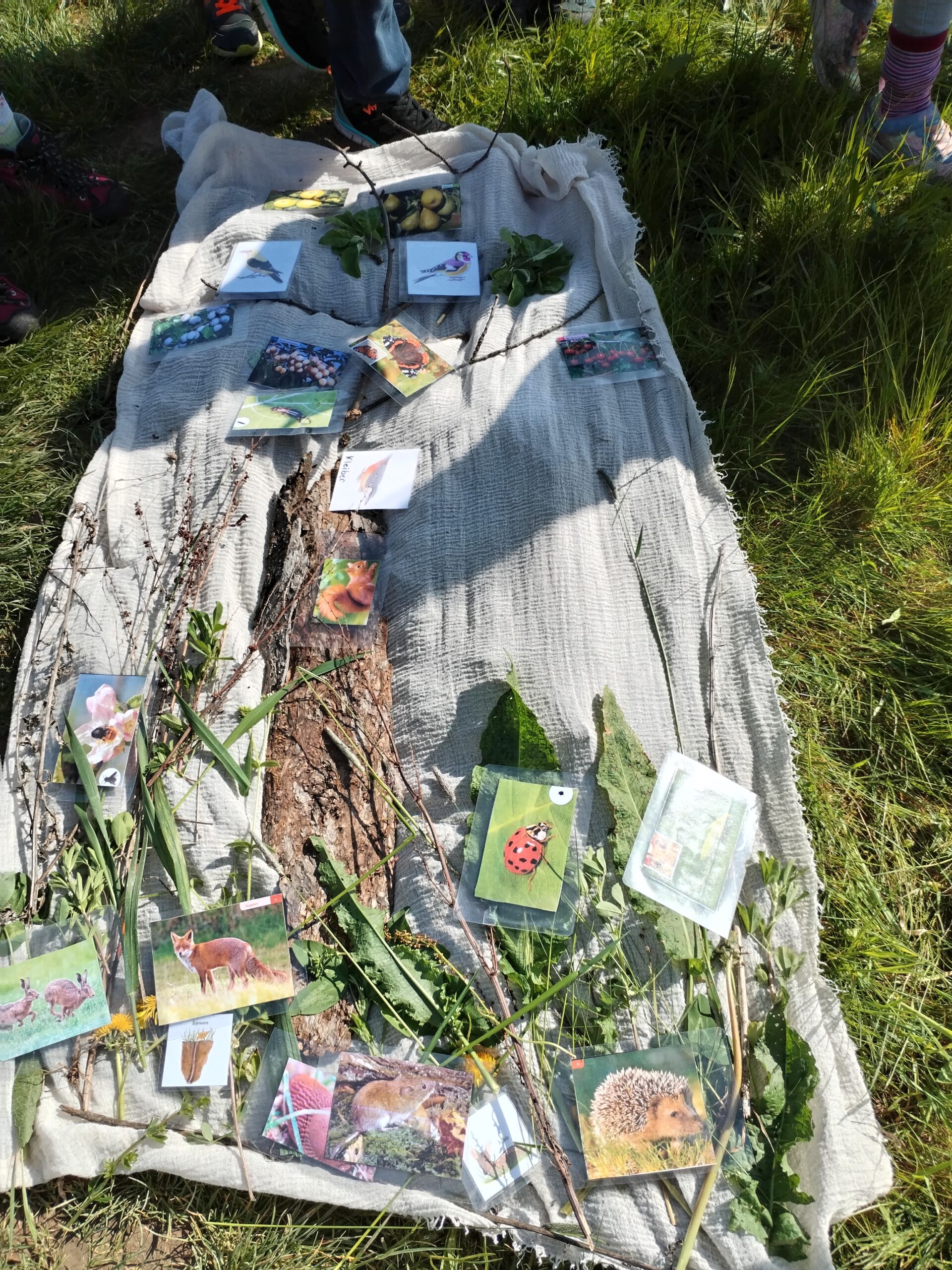 Da wurden die Obstbäume: Apfel-, Birnen-, Pflaumen-, Kirschen- und Mirabellenbäume entdeckt, ein Bild aus Naturmaterialien auf der Wiese gelegt und mit Bildern von Vögeln, Insekten und anderen Tieren der Streuobstwiese ausgeschmückt. Auch ein „echter“, mutiger Marienkäfer hatte sich ins Bild getraut!