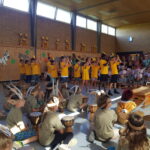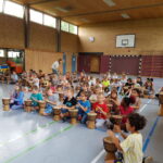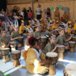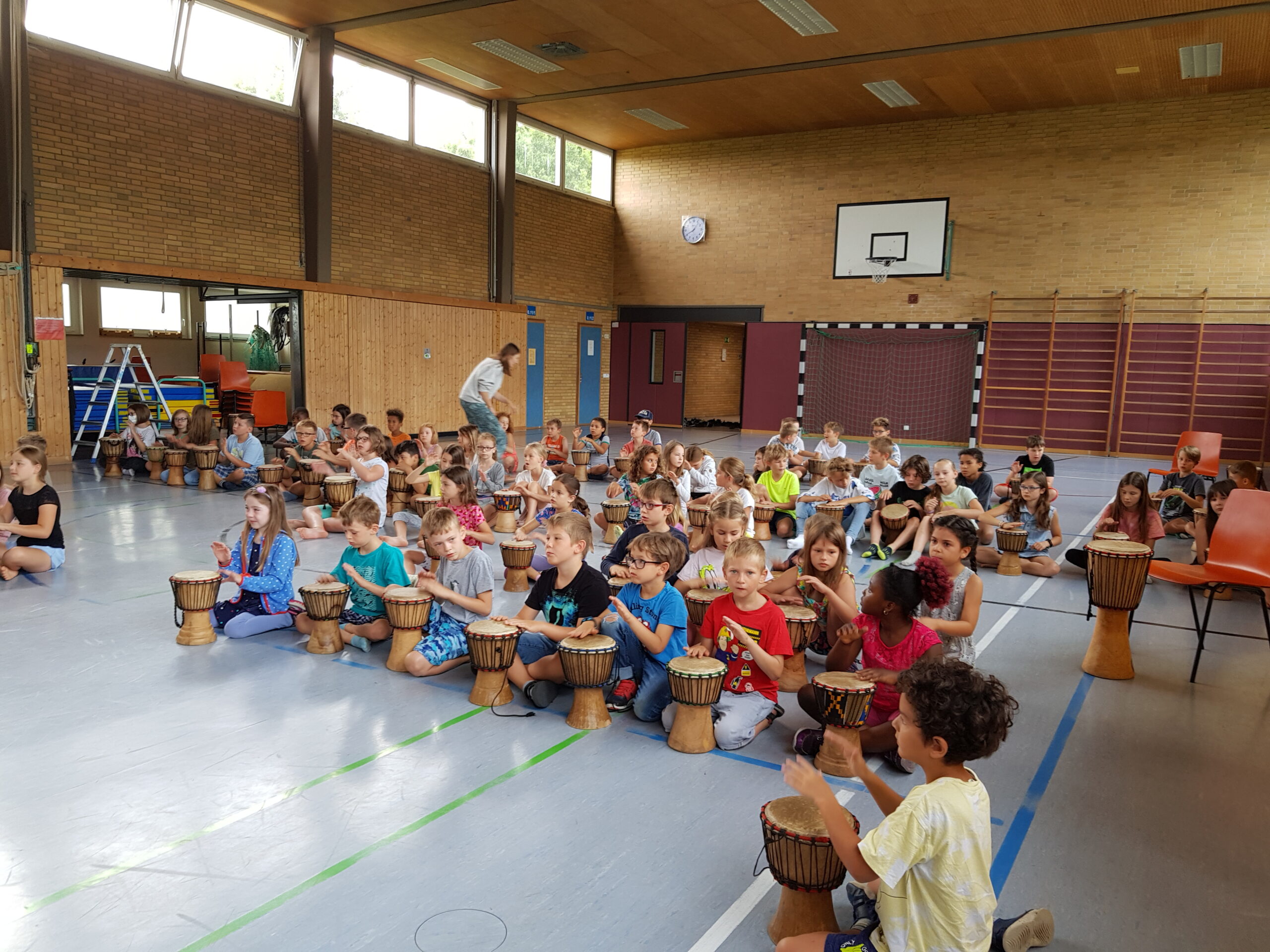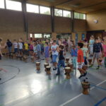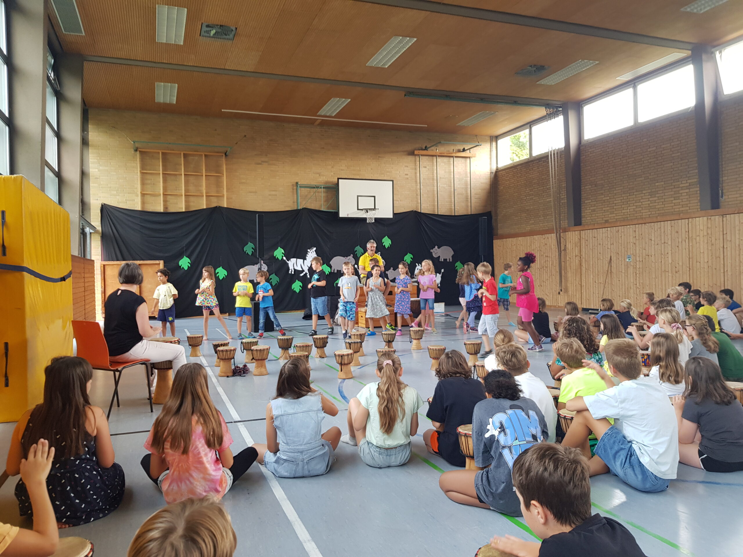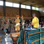 Die interaktive Aufführung am Freitagnachmittag war das absolute Highlight der Projektwoche. Kinder, Eltern, Omas und Opas, Geschwister, Lehrer und alle anderen Gäste sangen und tanzten gemeinsam, stets vom Klang der knapp 90 Djemben begleitet. Die abschließende „Trommel-prüfung“ bestanden alle Kinder mit Bravour. Das Urteil darüber fällten die Gäste durch ihren Applaus. So manch einer zog mit dem Ohrwurm „Komm, wir geh‘n nach Tamborena“ aus der Halle. Alle waren sich einig, dass es eine rundum gelungene Projektwoche war.