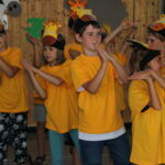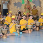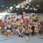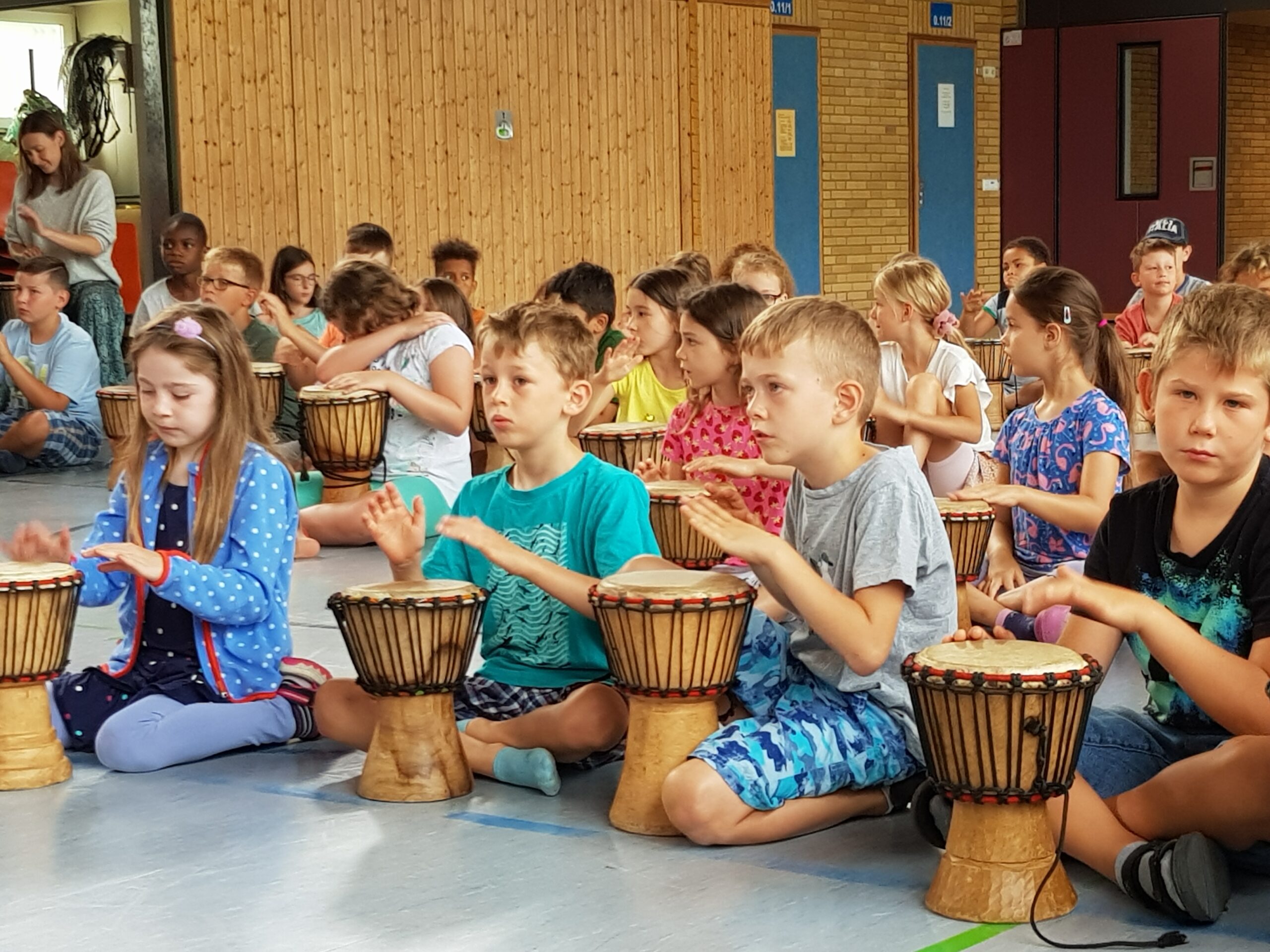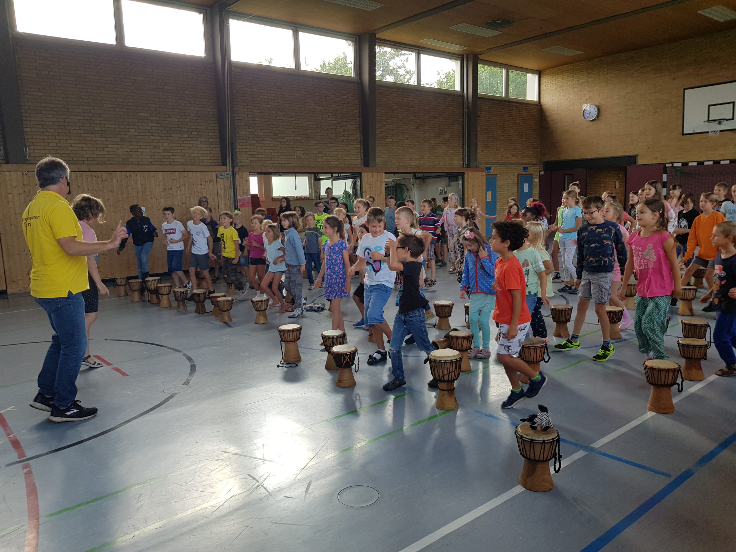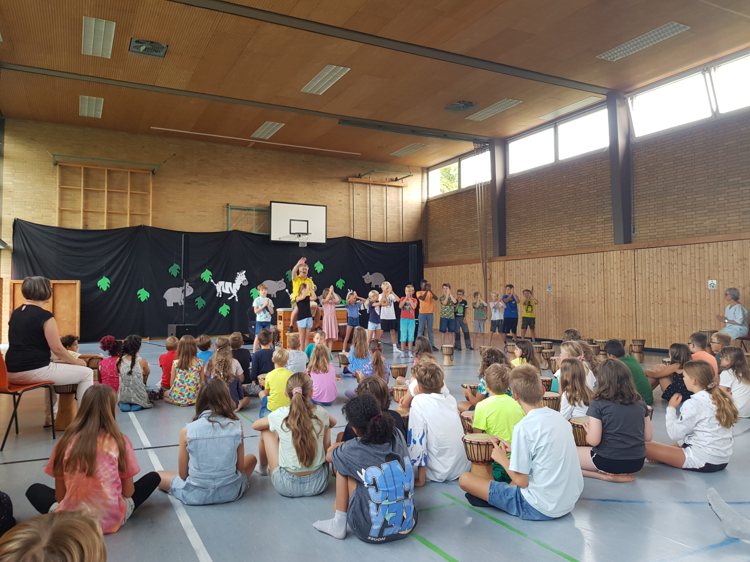 Zusätzlich zum gemeinsamen morgentlichen Trommeln genoss jede Klasse täglich eine Exklusiveinheit mit dem Trommelzauberer Arnd. Hier wurden lustige Spiele zu Trommelmusik gespielt und Elemente für die Aufführung erarbeitet.
