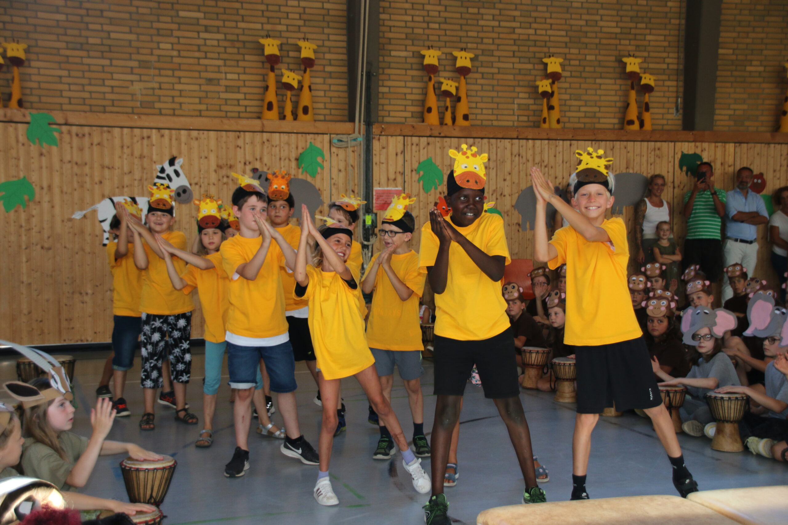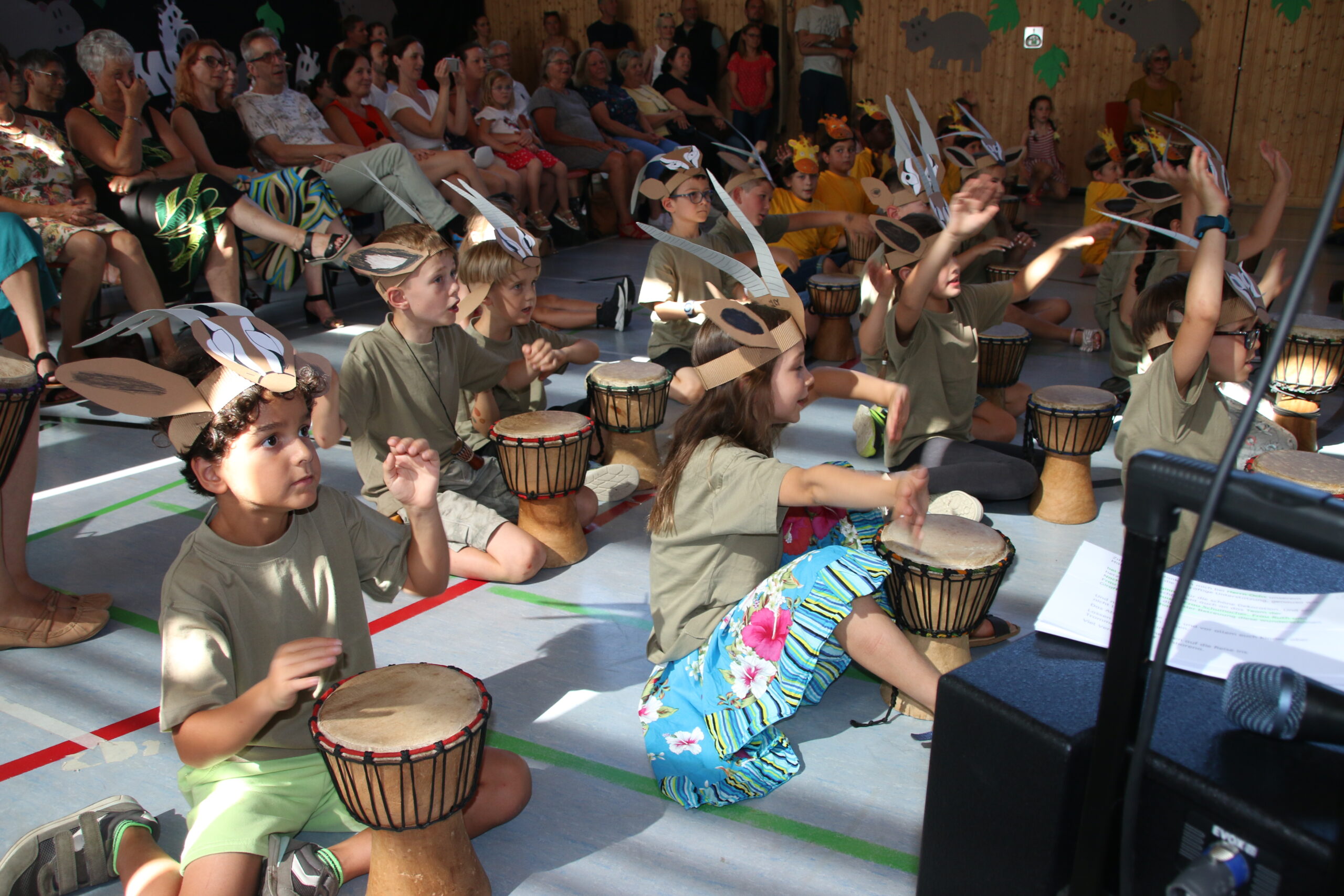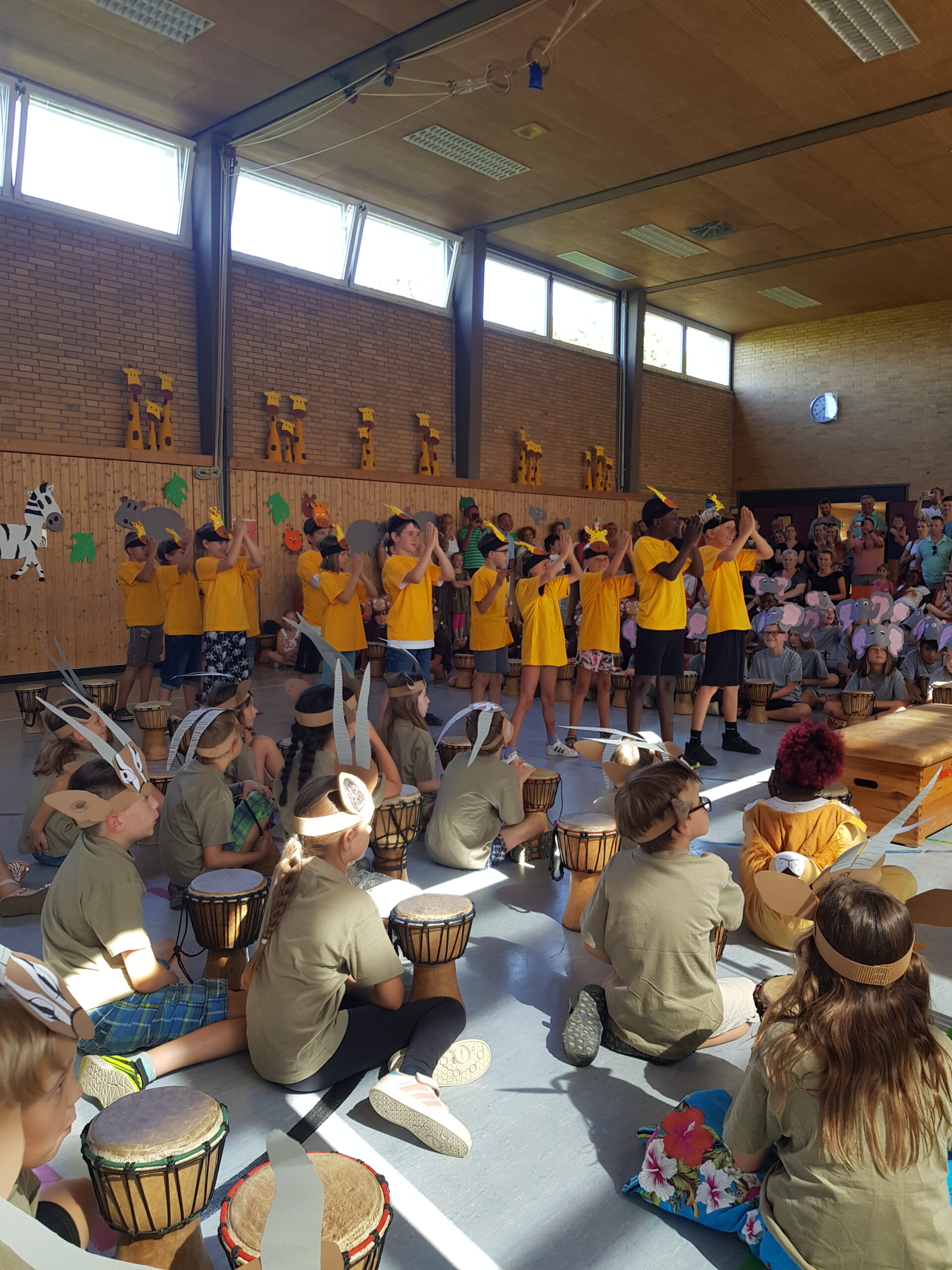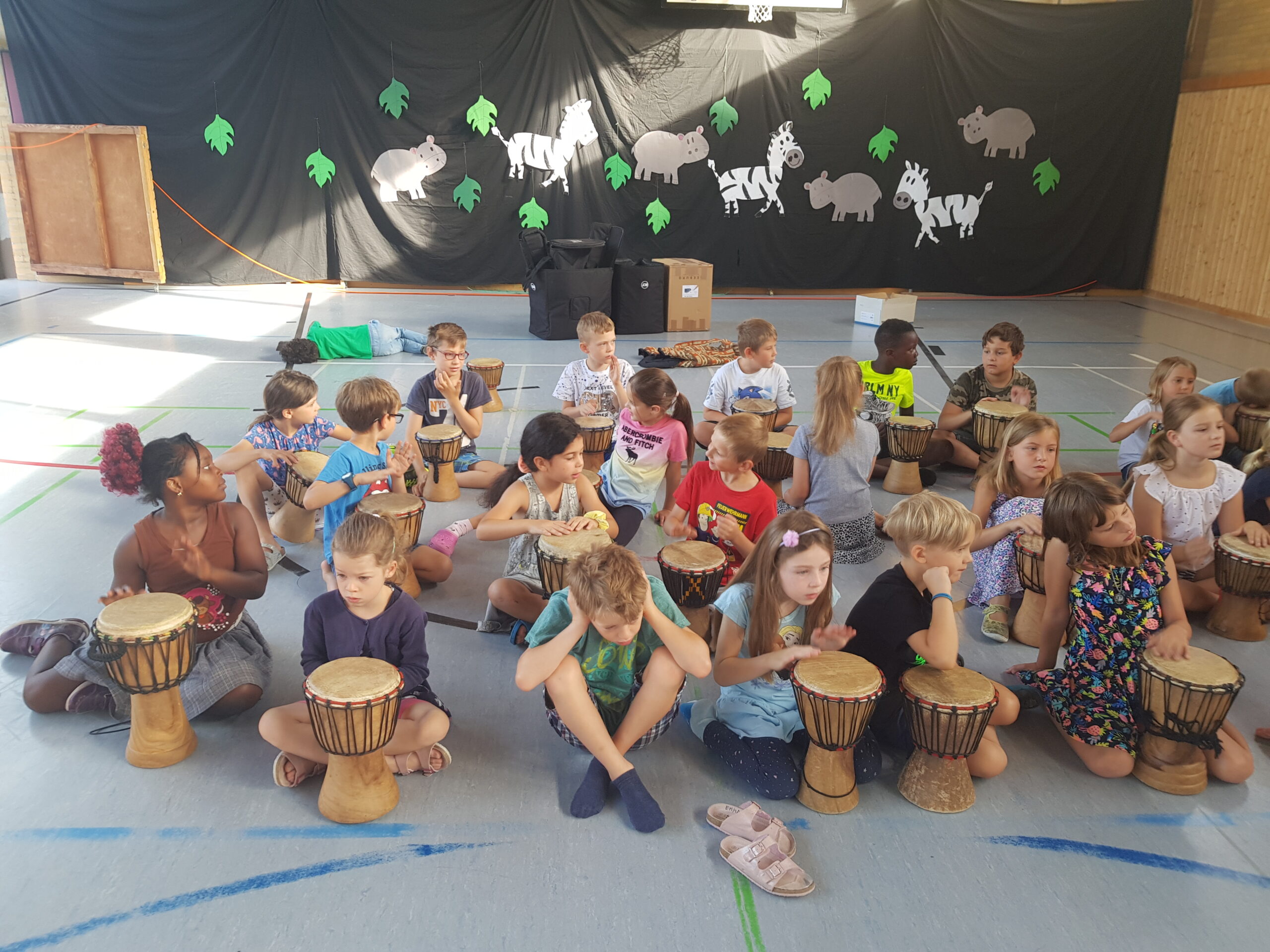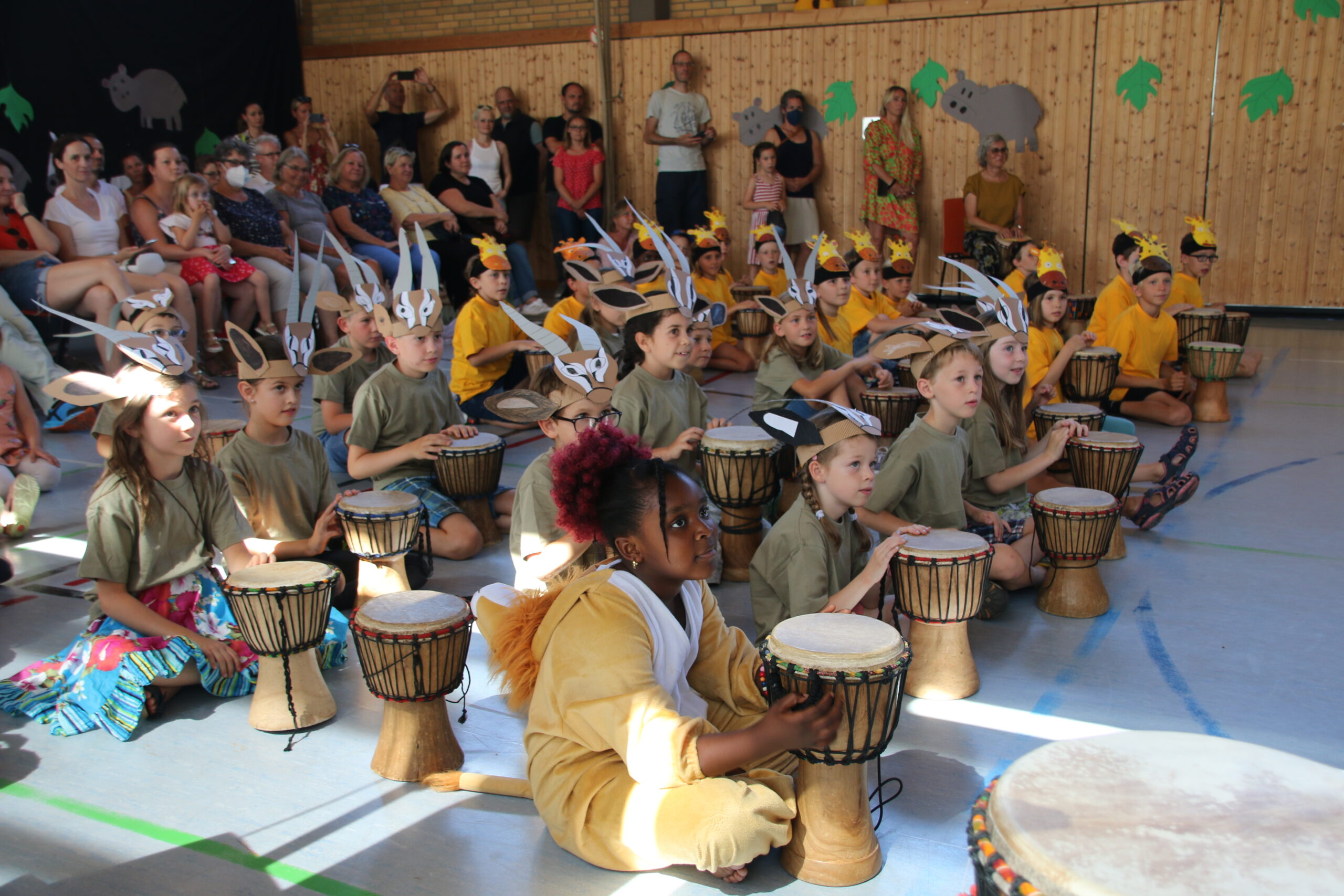 In der diesjährigen Projektwoche vom 11. – 15. Juli ging es bei uns in der HTS sehr lebhaft afrikanisch zu. Jeden Morgen um 8 Uhr trafen wir (alle Kinder und Lehrerinnen) uns mit dem Trommelzauberer Arnd Dalbeck in der Turnhalle zum gemeinsamen Trommel-Warm-up. Mit einem imaginären Flugzeug flogen wir ins Trommelzauberdorf Tamborena, nicht ohne zuvor noch eine letzte Trommel-SMS an die Eltern zu schicken. In Tamborena lernten wir viele unterschied-liche Djembé-Rhythmen, tanzten fröhlich als Gazellen (Kl.1), Giraffen (Kl.2), Elefanten (Kl.3) und Affen (Kl.4) und sangen gemeinsam stimmungsvolle Lieder.