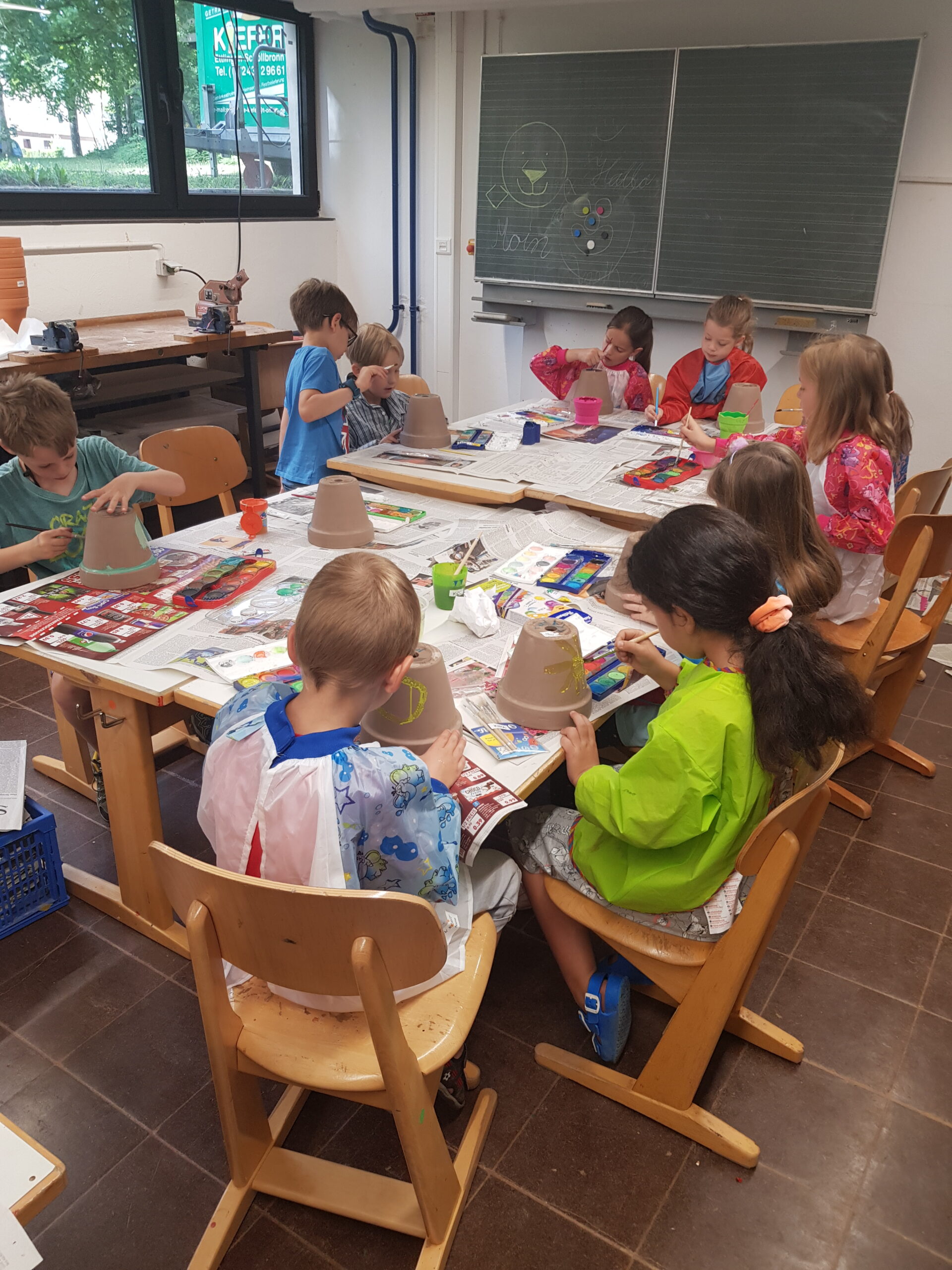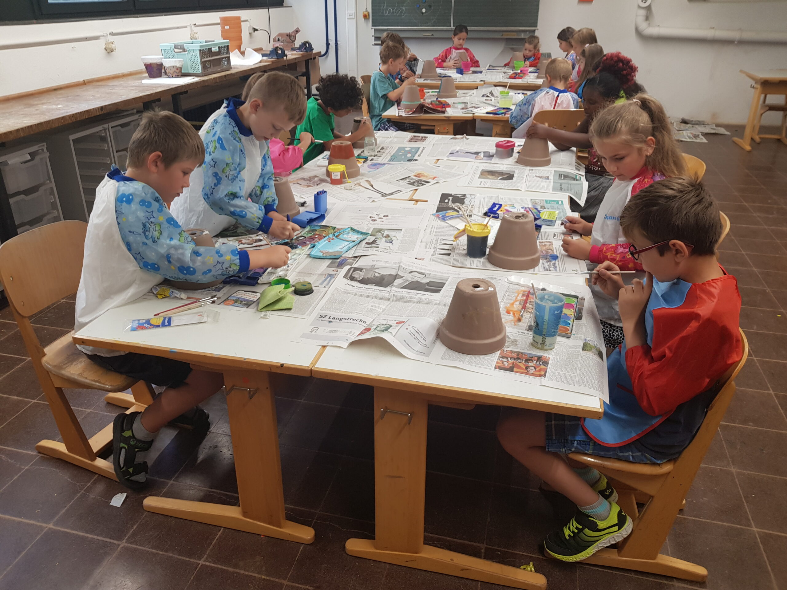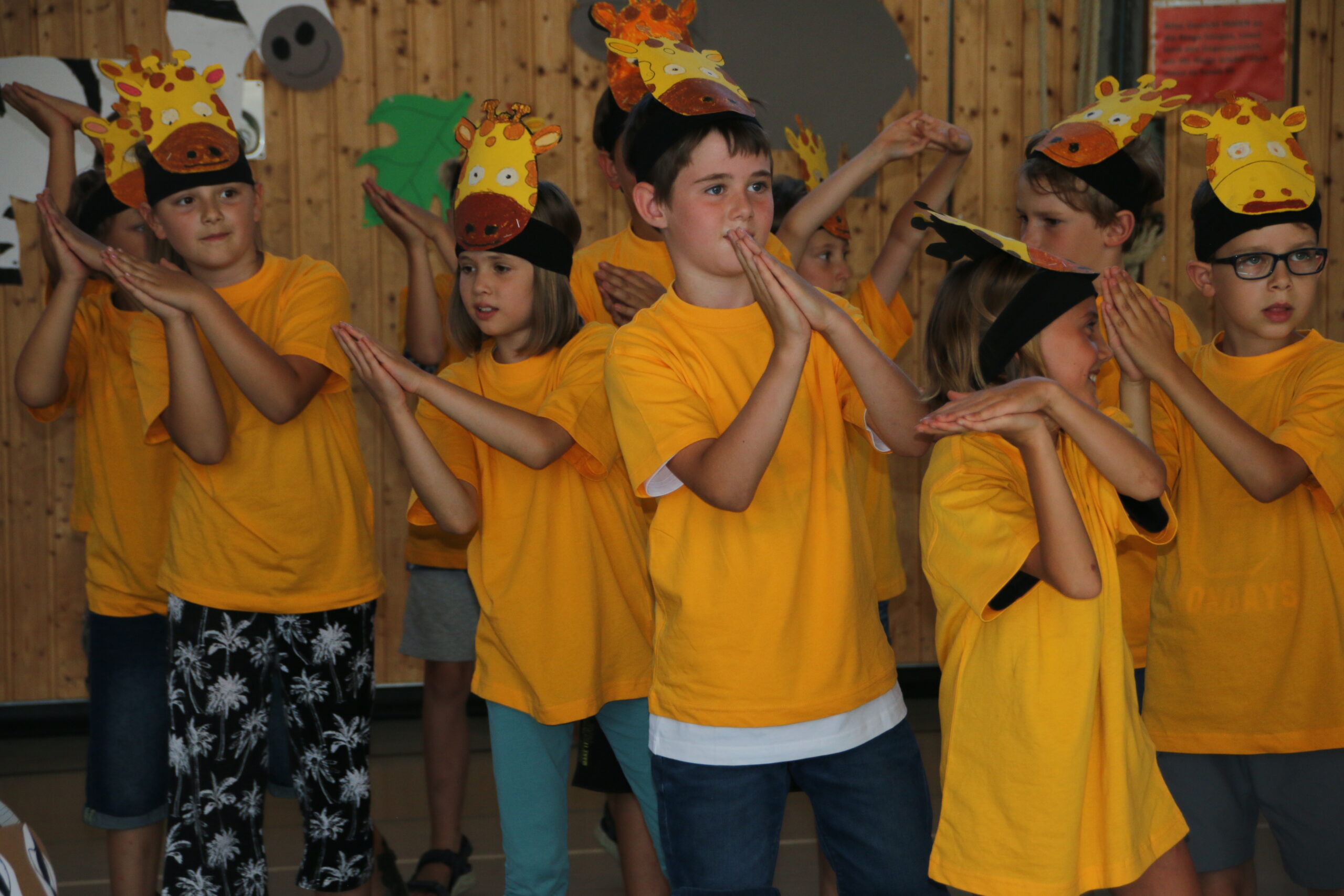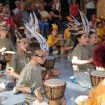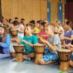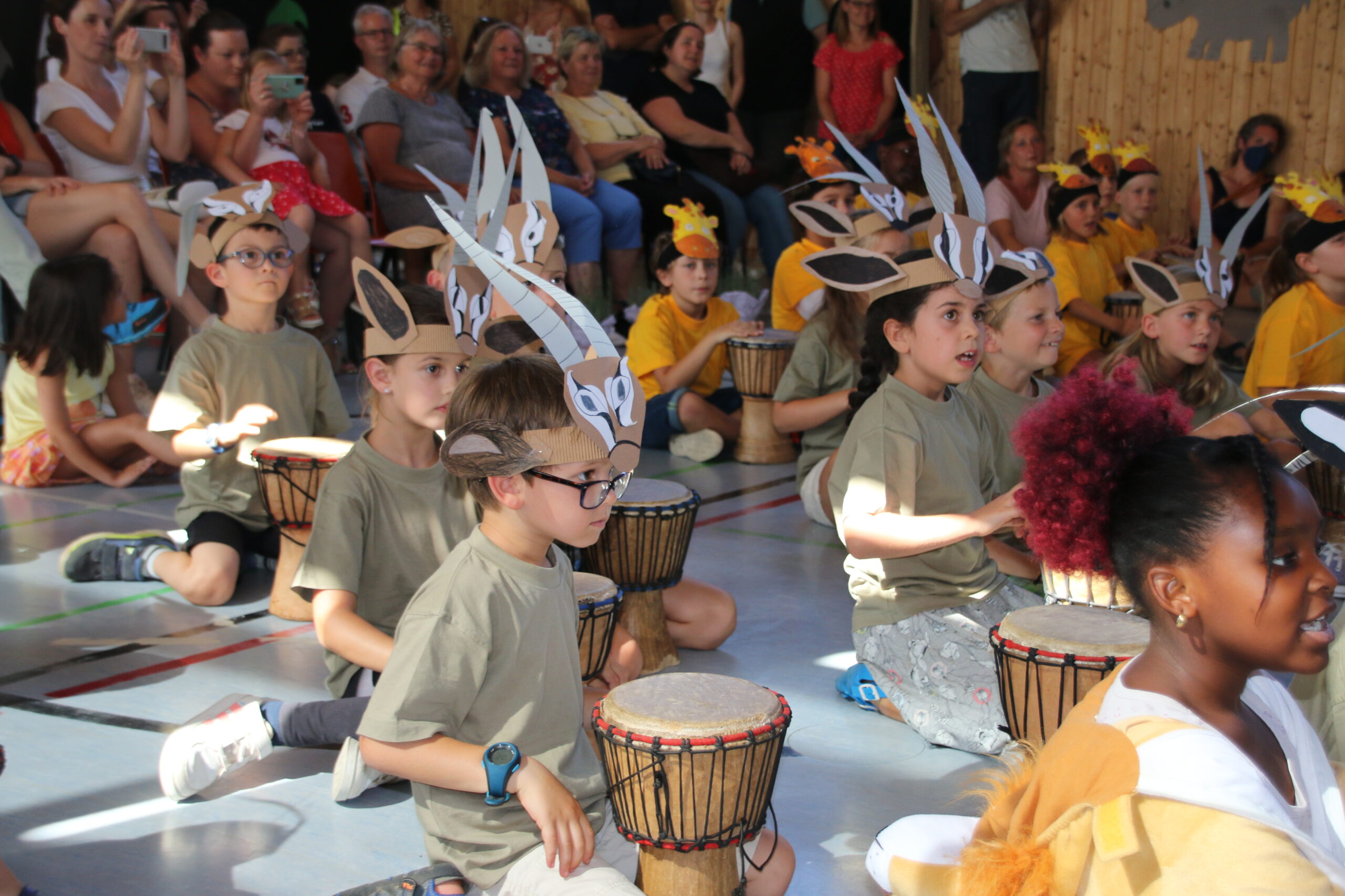 In der diesjährigen Projektwoche vom 11. – 15. Juli ging es bei uns in der HTS sehr lebhaft afrikanisch zu. Jeden Morgen um 8 Uhr trafen wir (alle Kinder und Lehrerinnen) uns mit dem Trommelzauberer Arnd Dalbeck in der Turnhalle zum gemeinsamen Trommel-Warm-up. Mit einem imaginären Flugzeug flogen wir ins Trommelzauberdorf Tamborena, nicht ohne zuvor noch eine letzte Trommel-SMS an die Eltern zu schicken. In Tamborena lernten wir viele unterschied-liche Djembé-Rhythmen, tanzten fröhlich als Gazellen (Kl.1), Giraffen (Kl.2), Elefanten (Kl.3) und Affen (Kl.4) und sangen gemeinsam stimmungsvolle Lieder.